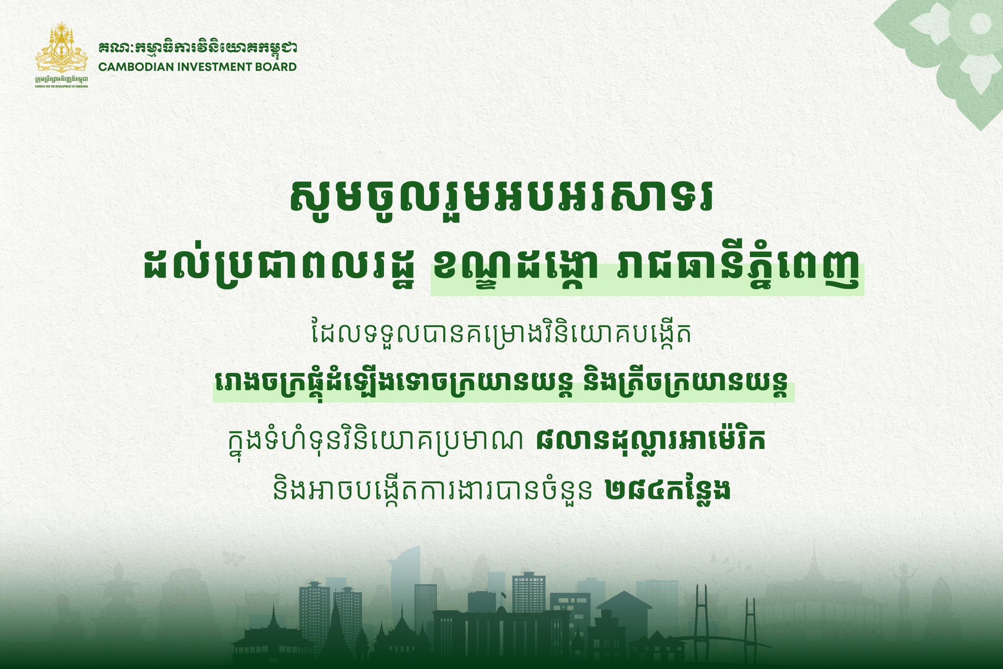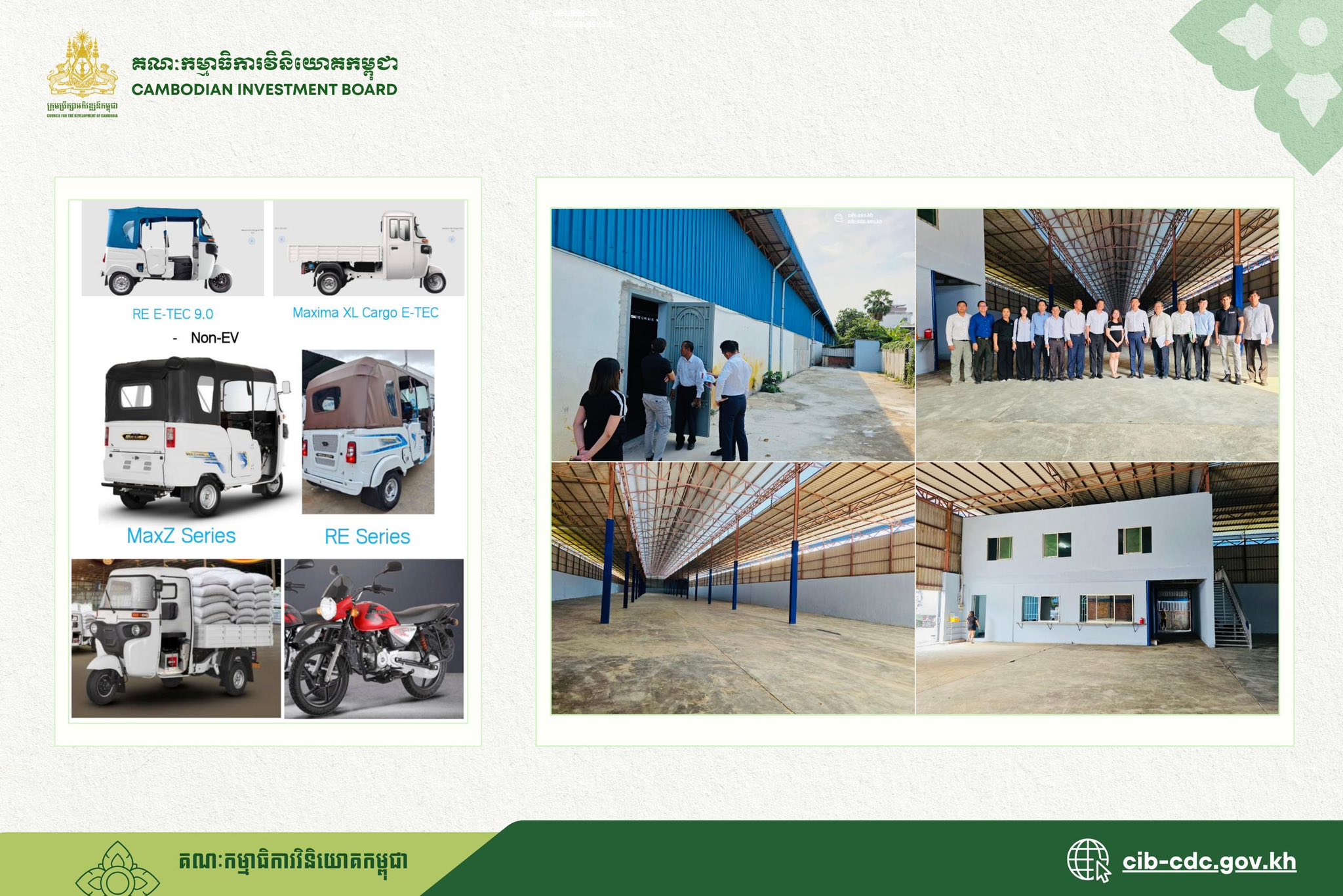 រោងចក្រនេះ គឺដំណើរការដោយក្រុមហ៊ុន Continental Mobility Co. Ltd អាចផ្តល់ការងារធ្វើជូនពលរដ្ឋសរុប២៨៤កន្លែង ហើយអាចមានសមត្ថភាព ផ្គុំដំឡើងទាំងទោចក្រយានយន្ត និងត្រីចក្រយានយន្តតែម្តង ៕