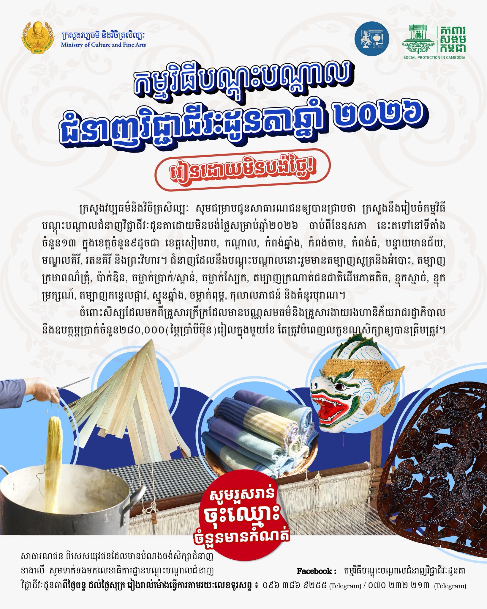 ក្រសួងវប្បធម៌ និងវិចិត្រសិល្បៈ បានប្រកាសឱ្យដឹងនៅថ្ងៃទី៦ ខែមេសា ឆ្នាំ២០២៦ ថា កម្មវិធីបណ្តុះបណ្តាលជំនាញវិជ្ជាជីវៈដូនតានេះ គឺនឹងដំណើរការដោយមិនបង់ថ្លៃឡើយ ហើយការបណ្តុះបណ្តាល គឺនឹងដំណើរការចាប់ពីខែឧសភា ខាងនេះតទៅនៅទីតាំង ចំនួន១៣ ក្នុងខេត្តចំនួន៩ ដូចជា ៖ ខេត្តសៀមរាប, កណ្តាល, កំពង់ឆ្នាំង, កំពង់ចាម, កំពង់ធំ, បន្ទាយមានជ័យ, មណ្ឌលគិរី, រតនគិរី និងព្រះវិហារ ។
