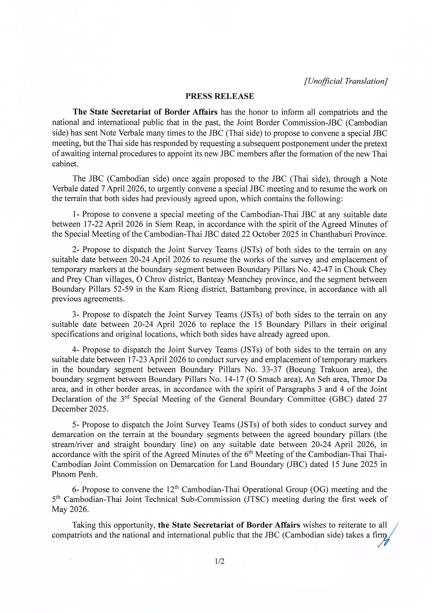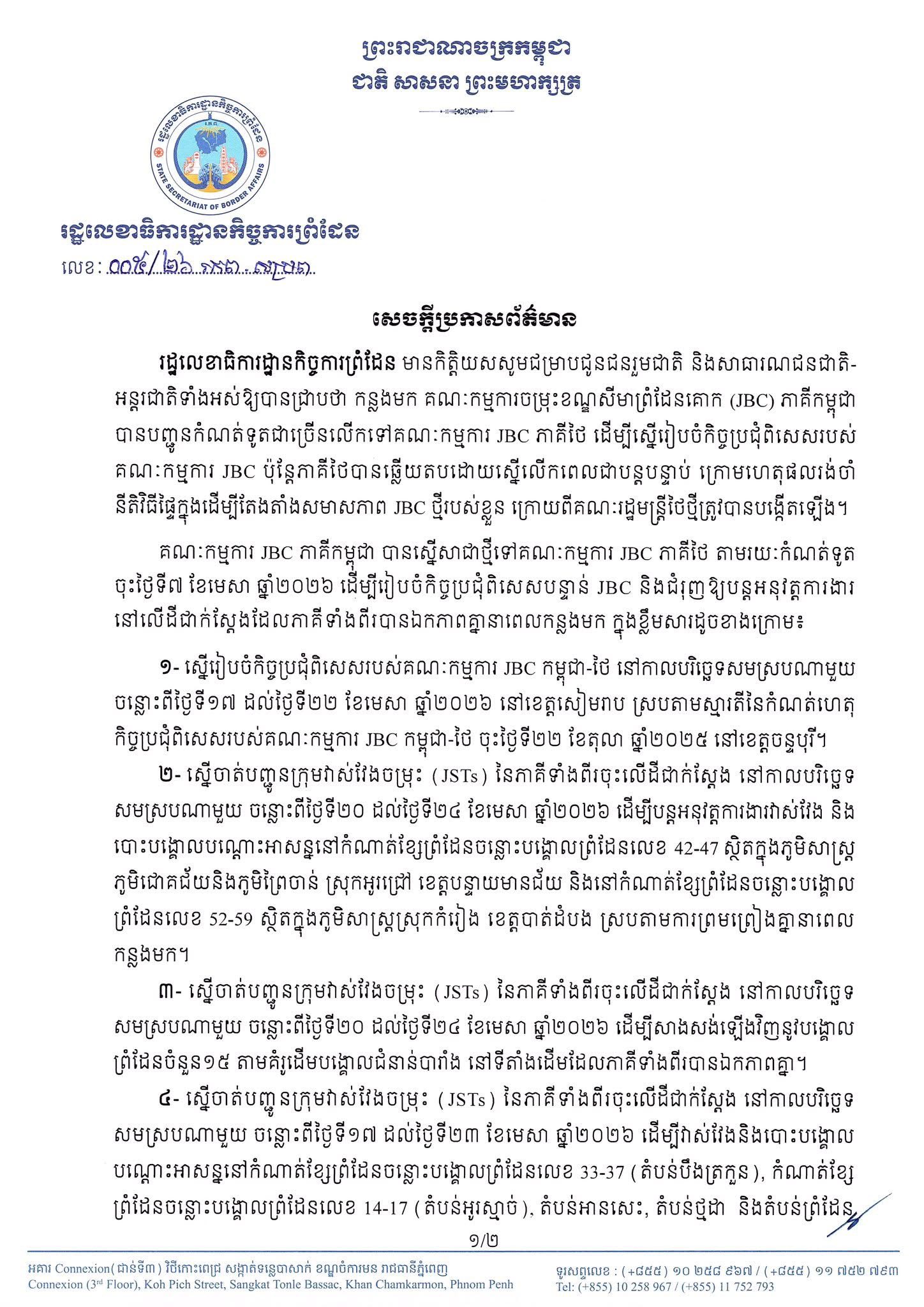 រដ្ឋលេខាធិការដ្ឋានកិច្ចការព្រំដែន នៅថ្ងៃទី៧ ខែមេសា ឆ្នាំ២០២៦ បានលើកឡើងថា កន្លងមក គណៈកម្មការចម្រុះខណ្ឌសីមាព្រំដែនគោក (JBC) ភាគីកម្ពុជា បានបញ្ជូនកំណត់ទូតជាច្រើន លើកទៅគណៈកម្មការ JBC ភាគីថៃ ដើម្បីស្នើរៀបចំកិច្ចប្រជុំពិសេសរបស់គណៈកម្មការ JBC ប៉ុន្តែភាគីថៃ បានឆ្លើយតបដោយស្នើលើកពេលជាបន្តបន្ទាប់ ក្រោមហេតុផលរង់ចាំ នីតិវិធីផ្ទៃក្នុង ដើម្បីតែងតាំងសមាសភាព JBC ថ្មីរបស់ខ្លួន ក្រោយពីគណៈរដ្ឋមន្ត្រីថៃថ្មី ត្រូវបានបង្កើតឡើង ។