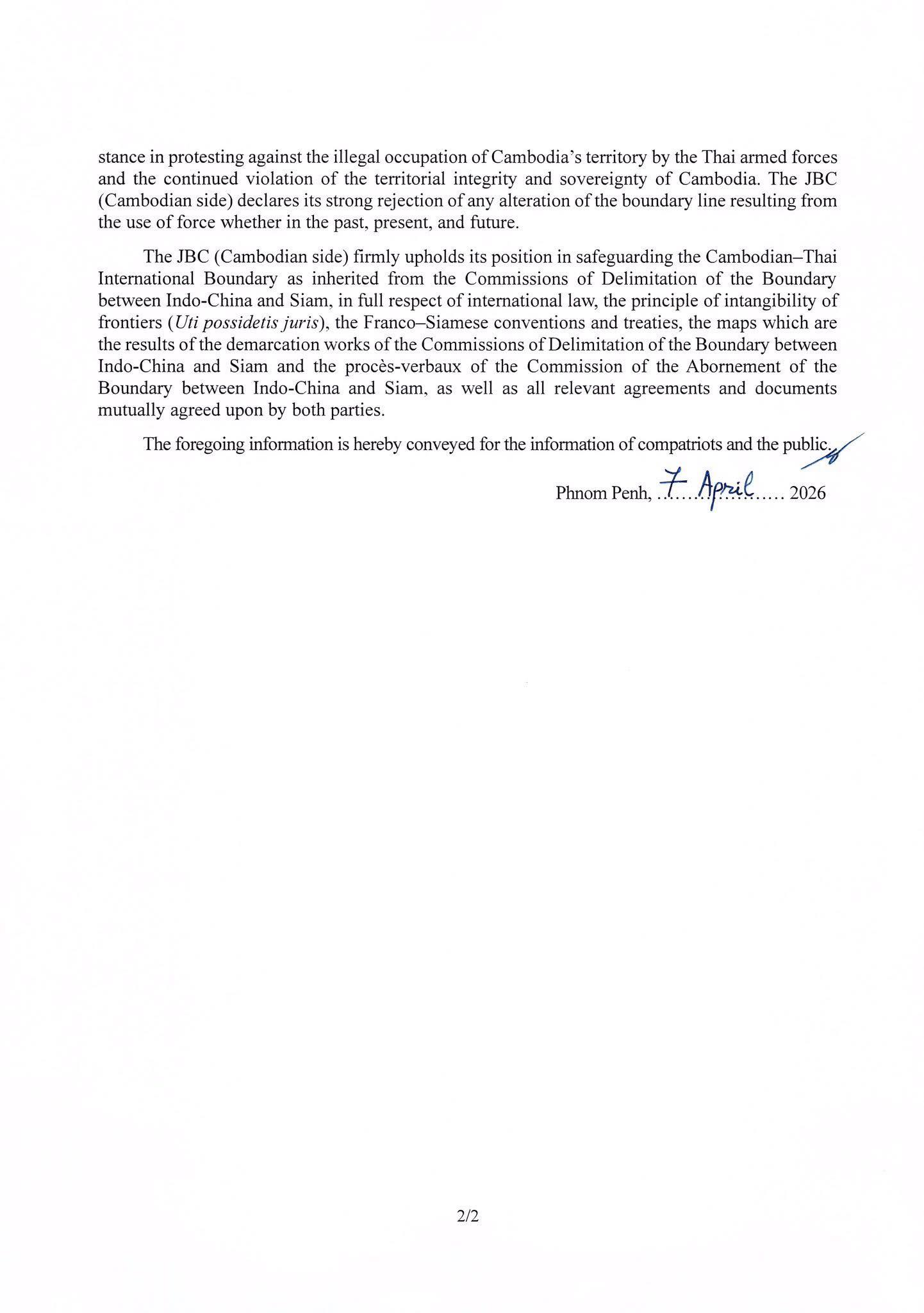 រដ្ឋលេខាធិការដ្ឋានកិច្ចការព្រំដែន សូមបញ្ជាក់ជូនសាជាថ្មីដល់ជនរួមជាតិ និងសាធារណជនជាតិ-អន្តរជាតិទាំងអស់ឱ្យបានជ្រាបថា គណៈកម្មការ JBC ភាគីកម្ពុជា ប្រកាន់ជំហរយ៉ាងម៉ឺងម៉ាត់ក្នុងការតវ៉ាប្រឆាំងយ៉ាងដាច់អហង្ការ ទៅនឹងសកម្មភាពឈ្លានពានកាន់កាប់ទឹកដីកម្ពុជា ដោយខុសច្បាប់របស់យោធាថៃ និងការបន្តធ្វើសកម្មភាពរំលោភបំពានលើបូរណភាពទឹកដីនិងអធិបតេយ្យកម្ពុជា ។