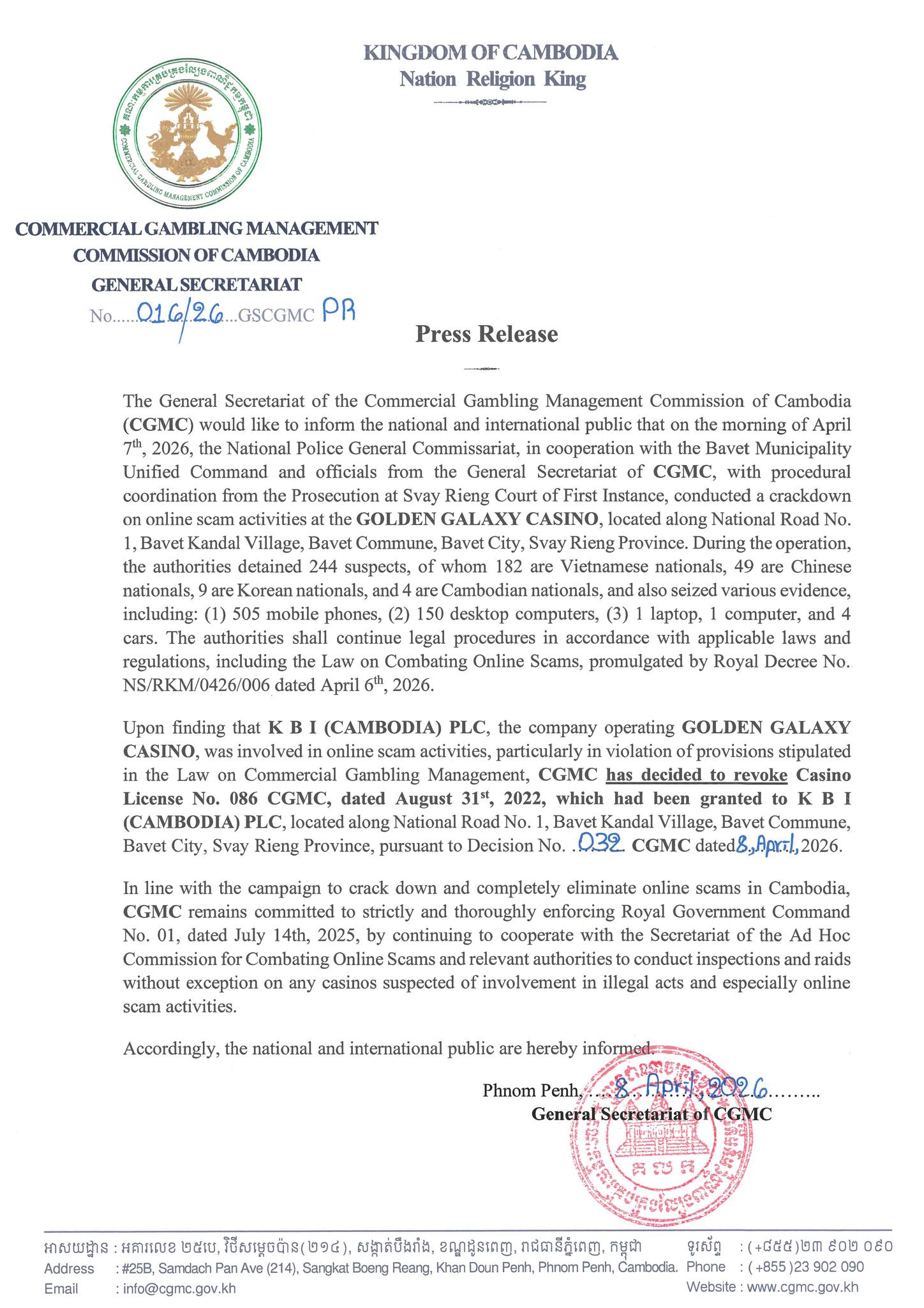 ក្នុងយុទ្ធនាការនៃការបោសសម្អាត និងការលុបបំបាត់ឱ្យបានទាំងស្រុងនូវការឆបោកតាមប្រព័ន្ធបច្ចេកវិទ្យា នៅកម្ពុជា, គ.ល.ក. នឹងប្តេជ្ញាបន្តអនុវត្តយ៉ាងម៉ឺងម៉ាត់ និងម៉ត់ចត់បំផុតតាមបទបញ្ជារាជរដ្ឋាភិបាល លេខ ០១ បប ចុះថ្ងៃទី១៤ ខែ កក្កដា ឆ្នាំ២០២៥ ដោយបន្តសហការជាមួយលេខាធិការដ្ឋាន គណៈកម្មការចំពោះកិច្ចប្រយុទ្ធប្រឆាំងការឆបោកតាមប្រព័ន្ធបច្ចេកវិទ្យា (ONLINE SCAMS) និងកម្លាំងមានសមត្ថកិច្ច ដើម្បីបន្តចុះប្រតិបត្តិការ ត្រួតពិនិត្យ និងឆែកឆេរ ដោយមិនមានករណីលើកលែងចំពោះ ទីតាំងក្រុមហ៊ុនកាស៊ីណូណាមួយ ដែលសង្ស័យថា មានជាប់ពាក់ព័ន្ធនឹងអំពើខុសច្បាប់ និងជាពិសេស ការឆបោកតាមប្រព័ន្ធបច្ចេកវិទ្យា នោះឡើយ ៕