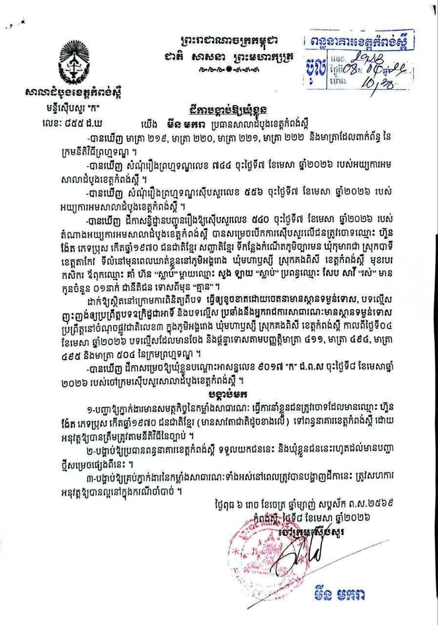 យោងតាមដីកាបង្គាប់ឱ្យឃុំខ្លួនរបស់ប្រធានសាលាដំបូងខេត្តកំពង់ស្ពឺ ឯកឧត្តម មីន មករា បានឃើញដីកាសន្និដ្ឋានបញ្ជូនរឿងឱ្យស៊ើបសួរពីតំណាងអយ្យការអមសាលាដំបូងខេត្តកំពង់ស្ពឺ បានសម្រេចបើកការស៊ើបសួរលើជនត្រូវចោទទាំង២ ត្រូវដាក់ឱ្យស្ថិតនៅក្រោមការពិនិត្យពីបទ ធ្វើឲ្យខូចខាតដោយចេតនាមានស្ថានទម្ងន់ទោស បទល្មើស ញុះញង់ឲ្យប្រព្រឹត្តបទឧក្រិដ្ឋជាអាទិ៍ និងបទល្មើសប្រឆាំងនឹងអ្នករាជការសាធារណៈ មានស្ថានទម្ងន់ទោស ប្រព្រឹត្តនៅចំណុចផ្លូវជាតិលេខ៣ ក្នុងភូមិអង្គរោង ឃុំមហាឫស្សី ស្រុកគងពិសី ខេត្តកំពង់ស្ពឺ កាលពីថ្ងៃទី៤ ខែមេសា ឆ្នាំ២០២៦ ។ បទល្មើសដែលមានចែង និងផ្តន្ទាទោសតាមបញ្ញត្តិមាត្រា ៤១១, មាត្រា ៤៩៨. មាត្រា ៤៩៥ និងមាត្រា ៥០៤ នៃក្រមព្រហ្មទណ្ឌ ។