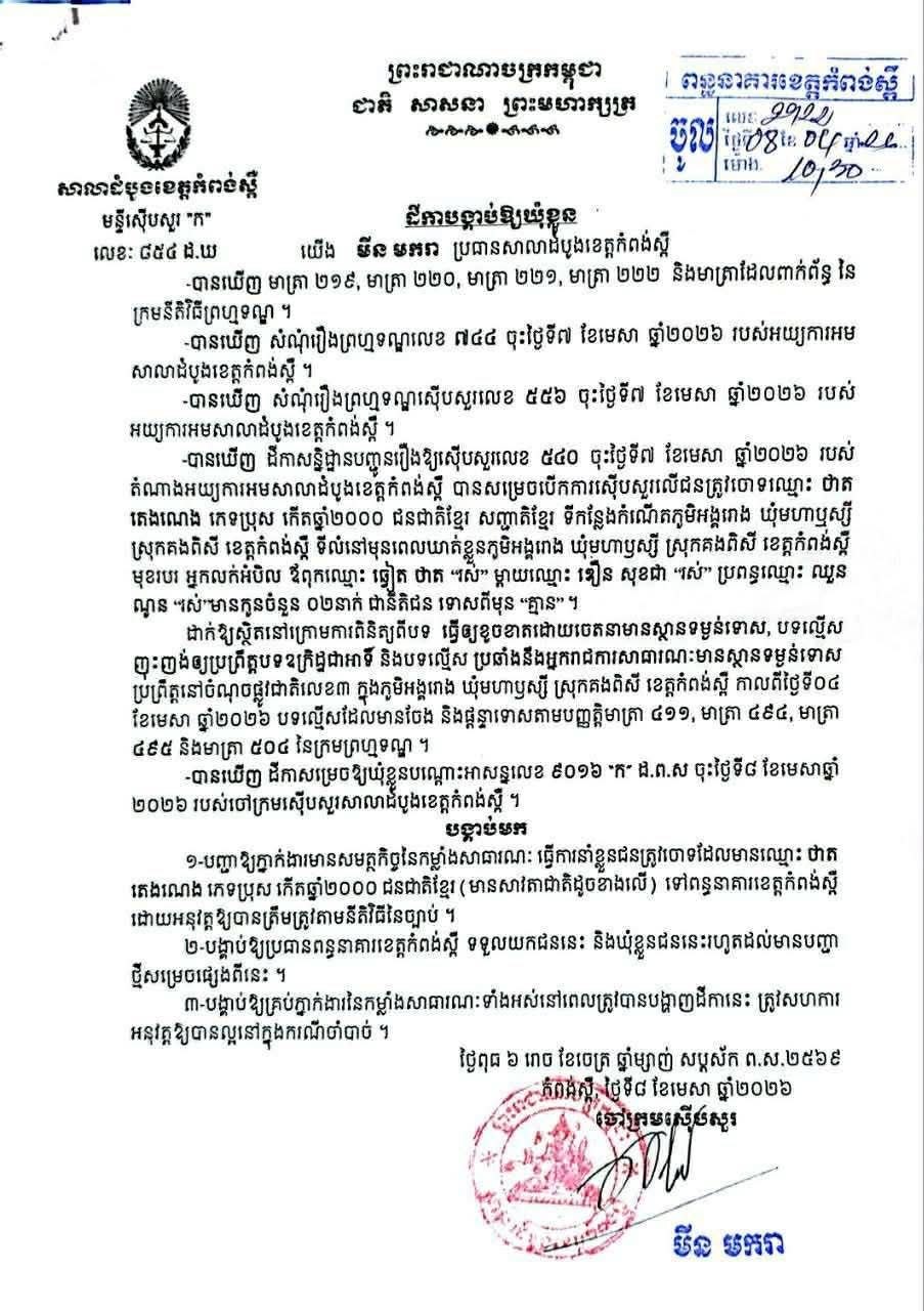 បញ្ជាឱ្យភ្នាក់ងារមានសមត្ថកិច្ចនៃកម្លាំងសាធារណៈ ធ្វើការនាំខ្លួនជនត្រូវចោទទៅឃុំខ្លួននៅពន្ធនាគារខេត្តកំពង់ស្ពឺ ដោយអនុវត្តឱ្យបានត្រឹមត្រូវតាមនីតិវិធី ៕