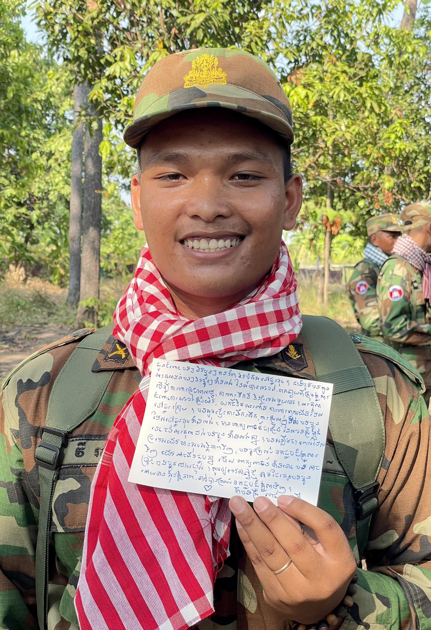 ជាក់ស្តែងយោងតាមការបង្ហោះសារនៅក្នុងហ្វេសប៊ុករបស់យុទ្ធជនម្នាក់ដែលជាទាហានការពារព្រំដែនបានបង្ហោះថា ៖ ខ្ញុំបាទ ឈ្មោះ វី រស្មី ជាទាហានដែរកំពុងឈរជើងការពារ នៅទិសខេត្តព្រះវិហារ បានទទួលសំបុត្រពីបងស្រី ពេជ ចន្ទមុន្នី ដែលជាសារដ៏មានអត្ថន័យ នឹករឭក និងពាក្យពេចន៍ជូនពរដល់ពួកខ្ញុំទាំងអស់គ្នា។ ខ្ញុំអានហើយរំភើប ក្តុកក្តួលខ្លាំងណាស់បងស្រី ។