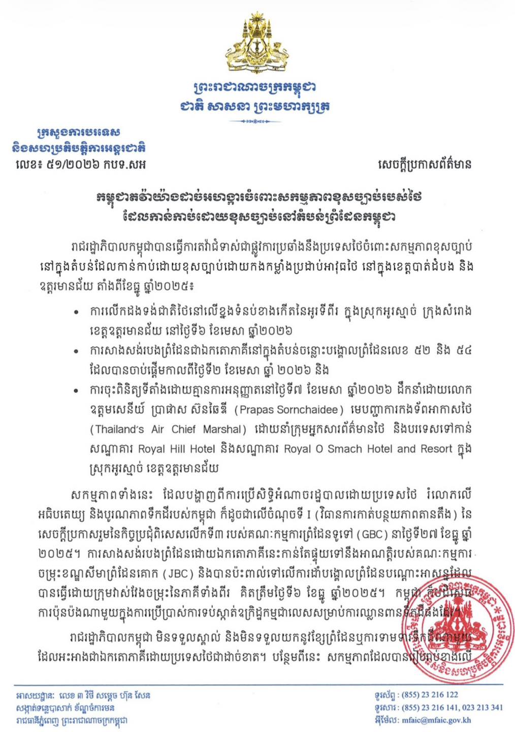 សកម្មភាពទាំងនេះ ដែលបង្ហាញពីការប្រើសិទ្ធិអំណាចរដ្ឋបាលដោយប្រទេសថៃ រំលោភលើអធិបតេយ្យ និងបូរណភាពទឹកដីរបស់កម្ពុជា ក៏ដូចជាលើចំណុចទី I (វិធានការកាត់បន្ថយភាពតានតឹង) នៃសេចក្តីប្រកាសរួម នៃកិច្ចប្រជុំពិសេសលើកទី៣ របស់គណៈកម្មការព្រំដែនទូទៅ (GBC) នាថ្ងៃទី២៧ ខែធ្នូ ឆ្នាំ ២០២៥។ ការសាងសង់របងព្រំដែនដោយឯកតោភាគីនេះ កាន់តែផ្ទុយទៅនឹងអាណត្តិរបស់គណៈកម្មការ ចម្រុះខណ្ឌសីមាព្រំដែនគោក (JBC) និងបានប៉ះពាល់ទៅលើការដាំបង្គោលព្រំដែនបណ្តោះអាសន្ន ដែលបានធ្វើដោយក្រុមវាស់វែងចម្រុះនៃភាគីទាំងពីរ គិតត្រឹមថ្ងៃទី៦ ខែធ្នូ ឆ្នាំ២០២៥។ កម្ពុជា ក៏បដិសេធការប៉ុនប៉ងណាមួយក្នុងការប្រើប្រាស់ការទប់ស្កាត់ឧក្រិដ្ឋកម្ម ជាលេសសម្រាប់ការឈ្លានពានទឹកដីផងដែរ ។