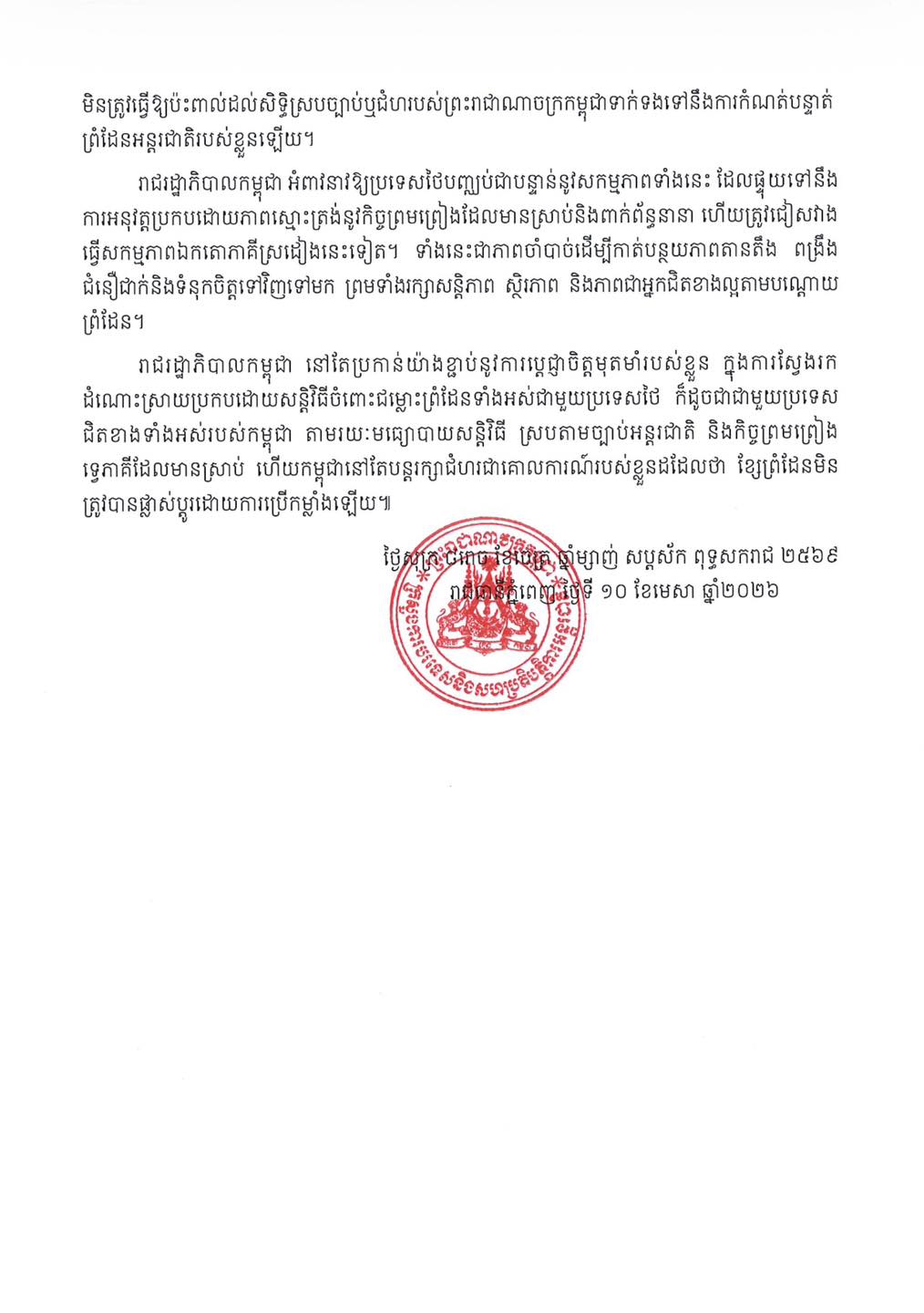 រាជរដ្ឋាភិបាលកម្ពុជា នៅតែប្រកាន់យ៉ាងខ្ជាប់ នូវការប្តេជ្ញាចិត្តមុតមាំរបស់ខ្លួន ក្នុងការស្វែងរកដំណោះស្រាយប្រកបដោយសន្តិវិធីចំពោះជម្លោះព្រំដែនទាំងអស់ជាមួយប្រទេសថៃ ក៏ដូចជាជាមួយប្រទេសជិតខាងទាំងអស់របស់កម្ពុជា តាមរយៈមធ្យោបាយសន្តិវិធី ស្របតាមច្បាប់អន្តរជាតិ និងកិច្ចព្រមព្រៀងទ្វេភាគី ដែលមានស្រាប់ ហើយកម្ពុជានៅតែបន្តរក្សាជំហរជាគោលការណ៍របស់ខ្លួនដដែលថា ខ្សែព្រំដែនមិនត្រូវបានផ្លាស់ប្តូរដោយការប្រើកម្លាំងឡើយ ៕