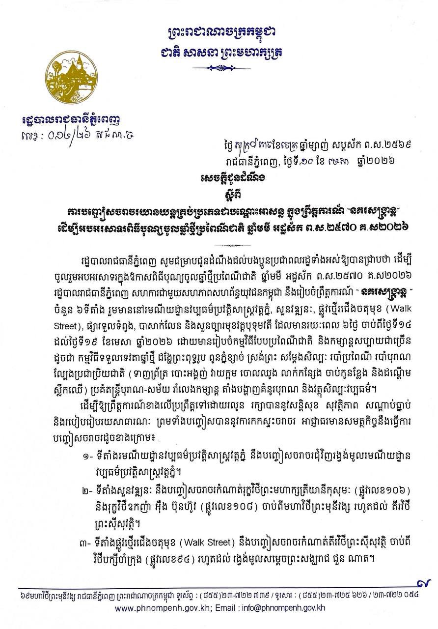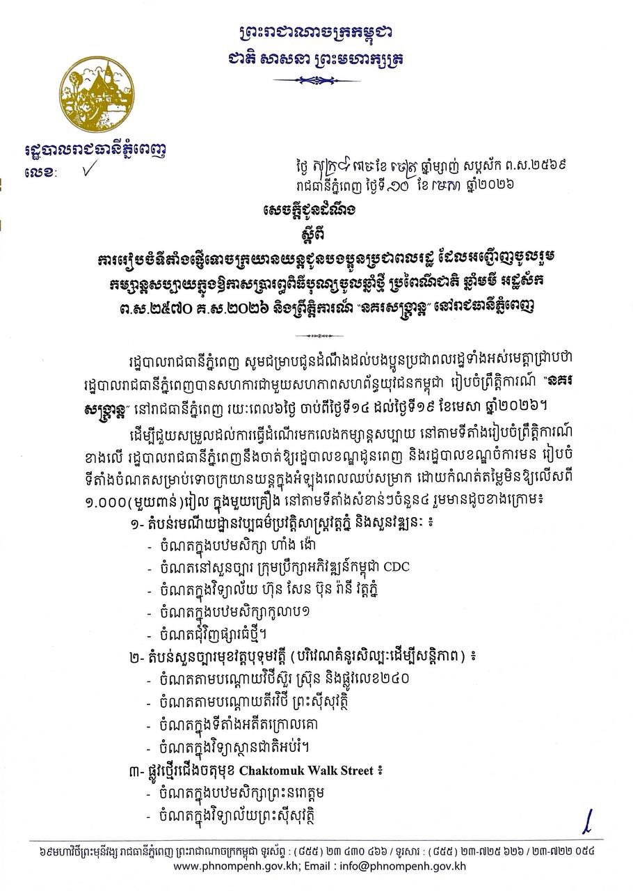 រាជធានីភ្នំពេញ ៖ រដ្ឋបាលរាជធានីភ្នំពេញ ជូនដំណឹងដល់បងប្អូនប្រជាពលរដ្ឋទាំងអស់ ឲ្យបានជ្រាបថា ដើម្បីចូលរួមអបអរសាទរ ក្នុងឱកាសពិធីបុណ្យចូលឆ្នាំថ្មី ប្រពៃណីជាតិ ឆ្នាំមមី អដ្ឋស័ក ព.ស.២៥៧០ គ.ស២០២៦ រដ្ឋបាលរាជធានីភ្នំពេញ សហការជាមួយសហភាពសហព័ន្ធយុវជនកម្ពុជា នឹងរៀបចំព្រឹត្តការណ៍ «នគរសង្ក្រាន្ត» ចំនួន ៦ទីតាំង រួមមាននៅរមណីយដ្ឋានវប្បធម៌ប្រវត្តិសាស្ត្រវត្តភ្នំ, សួនវឌ្ឍនៈ, ផ្លូវថ្មើរជើងចតុមុខ (Walk Street), ផ្សារទួលទំពូង, បាសាក់លែន និងសួនច្បារមុខវត្តបុទុមវតី ដែលមានរយៈពេល៦ថ្ងៃ ចាប់ពីថ្ងៃទី១៤ ដល់ថ្ងៃទី១៩ ខែមេសា ឆ្នាំ២០២៦ ដោយមានរៀបចំកម្មវិធីបែបប្រពៃណីជាតិ និងកម្សាន្តសប្បាយជាច្រើន ដូចជា កម្មវិធីទទួលទេវតាឆ្នាំថ្មី ដង្ហែព្រះពុទ្ធរូប ពូនភ្នំខ្សាច់ ស្រង់ព្រះ សម្តែងសិល្បៈ របាំប្រពៃណី របាំបុរាណ ល្បែងប្រជាប្រិយជាតិ (ទាញព្រ័ត្រ បោះអង្គញ់ វាយក្អម ចោលឈូង លាក់កន្សែង ចាប់កូនខ្លែង និងដណ្តើម ស្លឹកឈើ) ប្រគំតន្ត្រីបុរាណ-សម័យ រាំលេងកម្សាន្ត តាំងបង្ហាញគំនូរបុរាណ និងវត្ថុសិល្បៈវប្បធម៌។