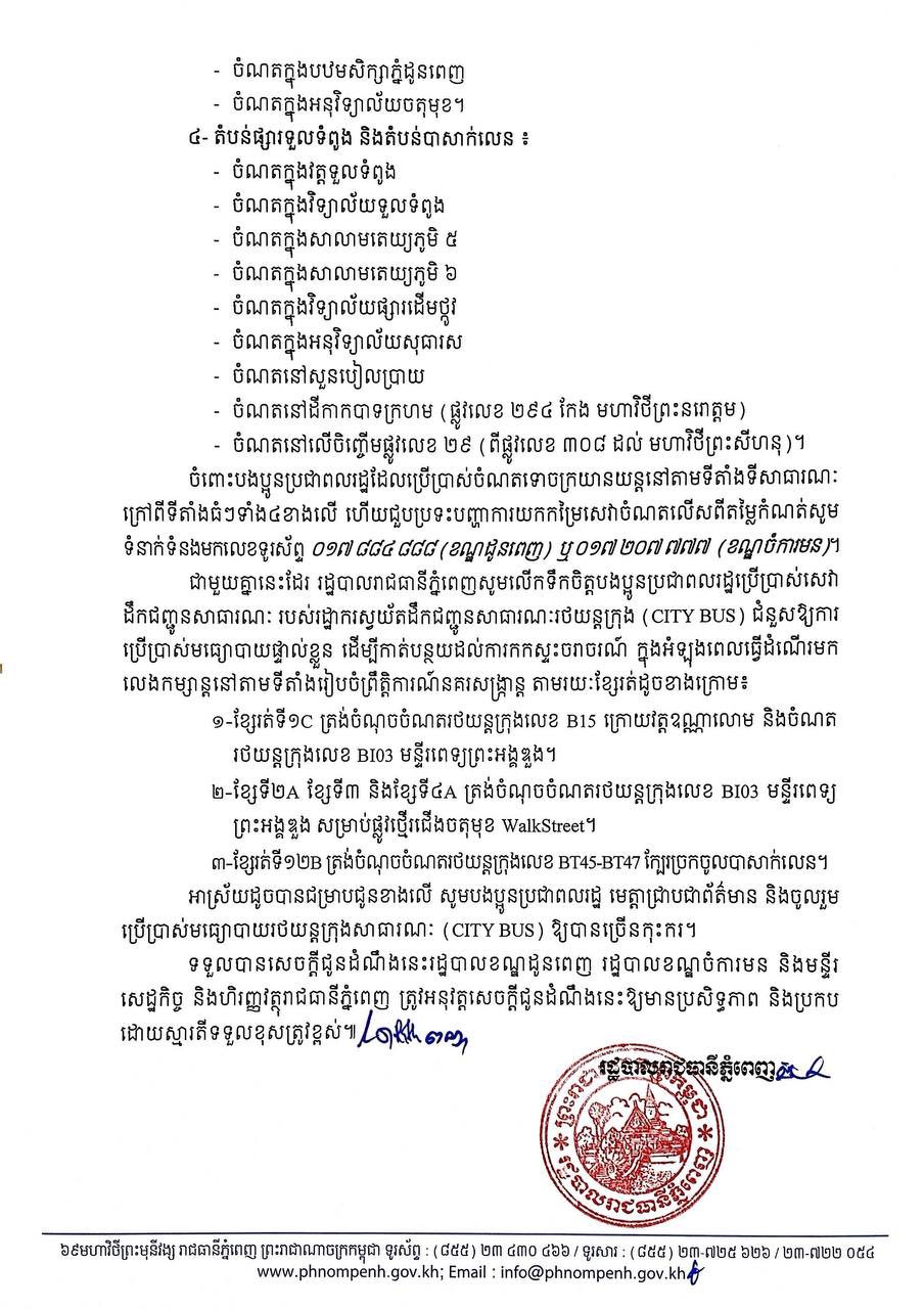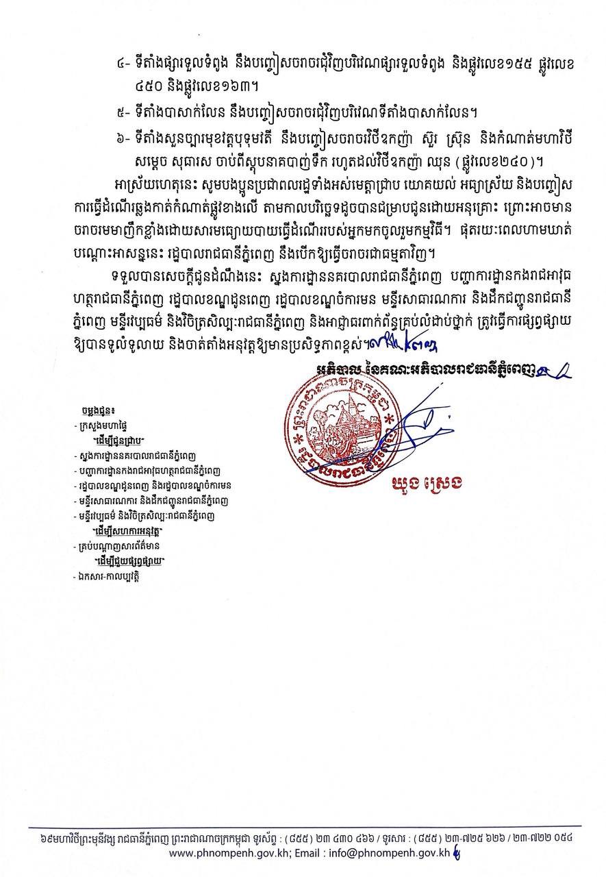 ដើម្បីឲ្យព្រឹត្តការណ៍ខាងលើប្រព្រឹត្តទៅដោយរលូន រក្សាបាននូវសន្តិសុខ សុវត្ថិភាព សណ្តាប់ធ្នាប់ និងរបៀបរៀបរយសាធារណៈ ព្រមទាំងបញ្ចៀសបាននូវការកកស្ទះចរាចរ អាជ្ញាធរមានសមត្ថកិច្ច នឹងធ្វើការបញ្ចៀសចរាចរ នៅតំបន់មួយចំនួន ។