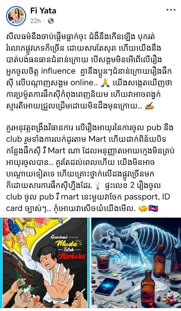 រយៈសំណេរបង្ហោះលើបណ្តាញសង្គម ហ្វីយ៉ាតា បានលើកឡើងថា សីលធម៌នឹងចាប់ផ្តើមធ្លាក់ចុះ ជំងឺនឹងកើនឡើង បុករត់ រំលោភផ្លូវភេទក៏ច្រើន ដោយសារតែសុរា ហើយយើងនឹងបាត់បង់ធនធានជំនាន់ក្រោយ បើសង្គមមិនអើពើលើរឿងអ្នកចូលចិត្ត influence គ្នានឹងប្អូនៗជំនាន់ក្រោយរឿងផឹកស៊ីលើបណ្ដាញសង្គម online.។
