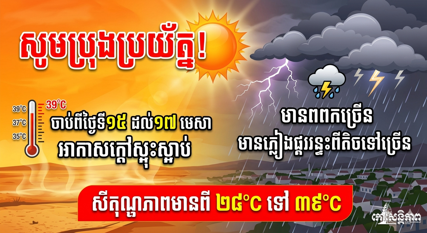 យោងតាមសេចក្តីជូនដំណឹងរបស់ក្រសួងធនធានទឹក អំពីស្ថានភាពអាកាសធាតុ រាជធានីភ្នំពេញ ចាប់ពីថ្ងៃទី១៥ ដល់ថ្ងៃទី១៧ ខែមេសា ឆ្នាំ២០២៦ បានលើកឡើងថា មន្ទីរធនធានទឹក និងឧតុនិយមរាជធានីភ្នំពេញ សូមគោរពជម្រាបជូនជាព័ត៌មានអំពីស្ថានភាពធាតុអាកាសចាប់ពីថ្ងៃទី១៥ រហូតដល់ថ្ងៃទី១៧ ខែមេសា ឆ្នាំ២០២៦ (ចូលឆ្នាំប្រពៃណីជាតិខ្មែរ) ខាងមុខនេះ ៖ ជ្រលងសម្ពាធទាប មានឥទ្ធិពលមកលើរាជធានីភ្នំពេញ ស្ថានភាពបែបនេះ និងបង្ករឱ្យធាតុអាកាសក្តៅស្អុះស្អាប់ មានពពកច្រើន មានភ្លៀងផ្គររន្ទះពីតិចទៅច្រើន សីតុណ្ហភាពមានពី ២៨°C ទៅ ៣៩°C ខ្យល់បក់មក ពីទិសទក្សិណ ល្បឿនពី ២ ទៅ ៥ម៉ែត្រ /វិនាទី និងមានខ្យល់កន្ត្រាក់ បក់ក្នុងល្បឿន ៥ ទៅ ៩ម៉ែត្រ /វិនាទី។