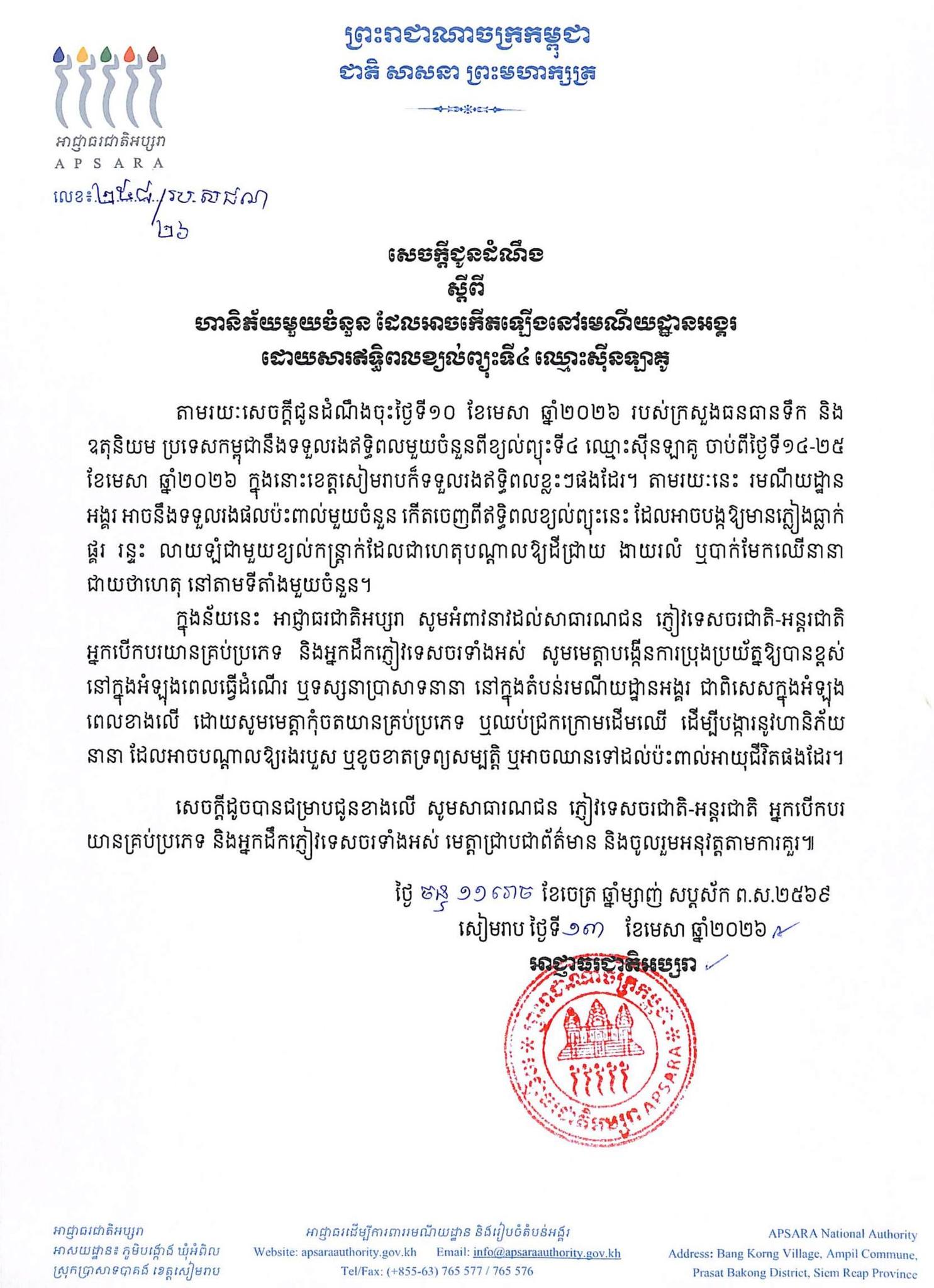ខេត្តសៀមរាប ៖ អាជ្ញាធរជាតិអប្សរា នៅថ្ងៃទី ១៣ ខែមេសា ឆ្នាំ២០២៦នេះ ជូនដំណឹងស្តីពី ហានិភ័យមួយចំនួន ដែលអាចកើតឡើងនៅរមណីយដ្ឋានអង្គរ ដោយសារឥទ្ធិពលខ្យល់ព្យុះទី៤ ឈ្មោះស៊ីនឡាគូ ។