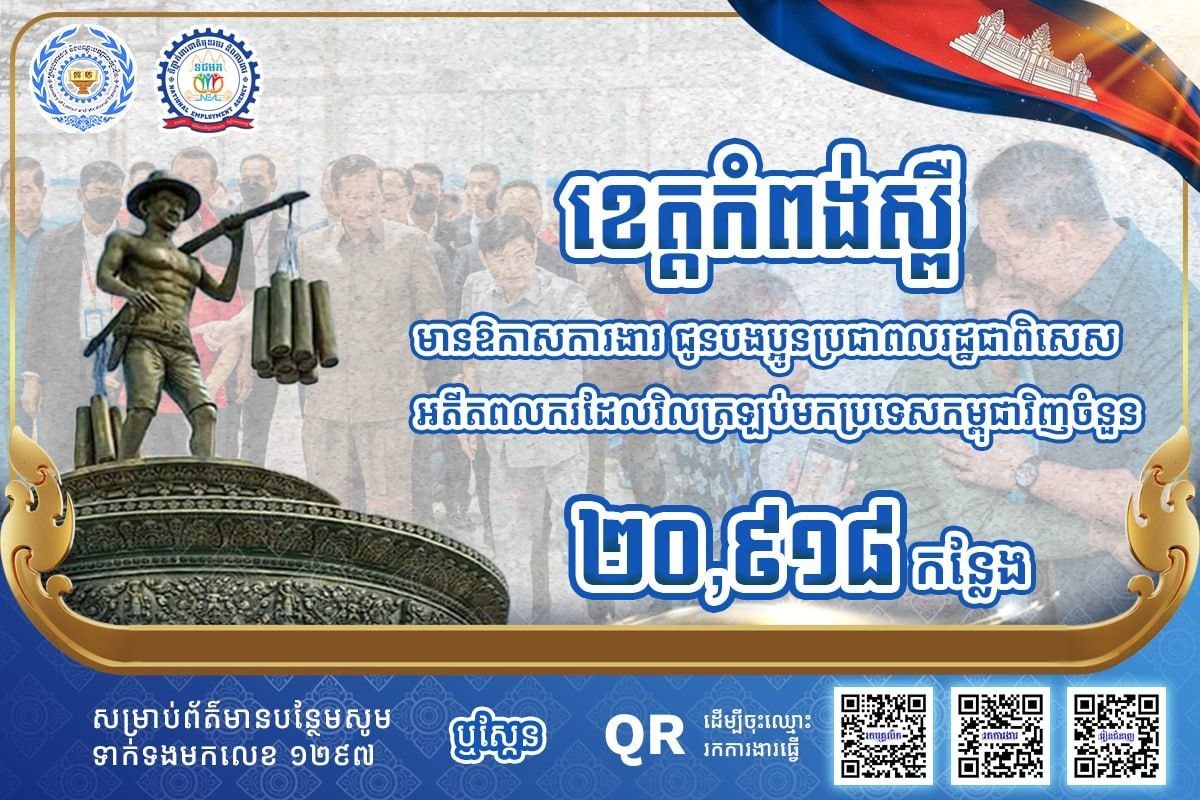 តាមរយៈការផ្សព្វផ្សាយ ក្រសួងការងារបានឱ្យដឹងថា គិតត្រឹមថ្ងៃទី ១៣ ខែមេសា ឆ្នាំ ២០២៦ មកនេះ ខេត្តកំពង់ចាម ខេត្តកំពង់ឆ្នាំង និងខេត្តកំពង់ធំមានឱកាសការងារសរុបចំនួន ២០,៩១៨កន្លែង កំពុងរង់ចាំបងប្អូនអតីតពលករត្រឡប់មកពីប្រទេសថៃ និងអ្នកកំពុងស្វែងរកការងារធ្វើនៅក្នុងវិស័យកសិកម្ម ឧស្សាហកម្ម និងវិស័យសេវាកម្ម ។