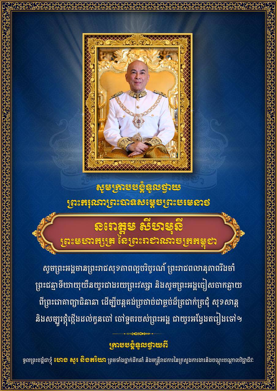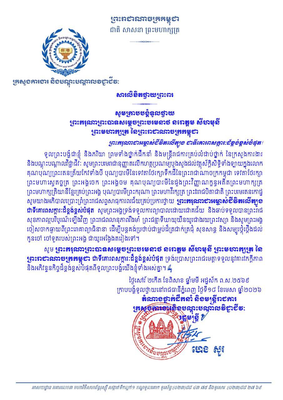 រាជធានីភ្នំពេញ៖ ឯកឧត្តម ហេង សួរ រដ្ឋមន្ត្រីក្រសួងការងារ និងបណ្តុះបណ្តាលវិជ្ជាជីវៈ នៅថ្ងៃទី១៨ ខែមេសា ឆ្នាំ២០២៦ បានចេញសារលិខិតក្រាបបង្គំទូលថ្វាយព្រះពរ ព្រះករុណាព្រះបាទសម្តេចព្រះបរមនាថ នរោត្តម សីហមុនី ព្រះមហាក្សត្រ នៃព្រះរាជាណាចក្រកម្ពុជា ជាទីសក្ការៈដ៏ខ្ពង់ខ្ពស់បំផុត ដោយបន់ស្រន់សូមព្រះអង្គទ្រង់ ទទួលការព្យាបាលដោយជោគជ័យ និងឆាប់ទទួលបានព្រះរាជសុខភាពល្អបរិបូរណ៍ឡើងវិញ ព្រះរាជពលានុភាពរឹងមាំ ព្រះជន្មាទីឃាយុយឺនយូរជាងរយព្រះវស្សាដើម្បីបន្តគង់ប្រថាប់ជាម្លប់ដ៏ត្រជាក់ត្រជុំ សុខសាន្ត និងសម្បូរថ្កុំថ្កើងដល់ កូនចៅ ចៅទួតរបស់ព្រះអង្គ ជាយូរអង្វែងតរៀងទៅ ។
