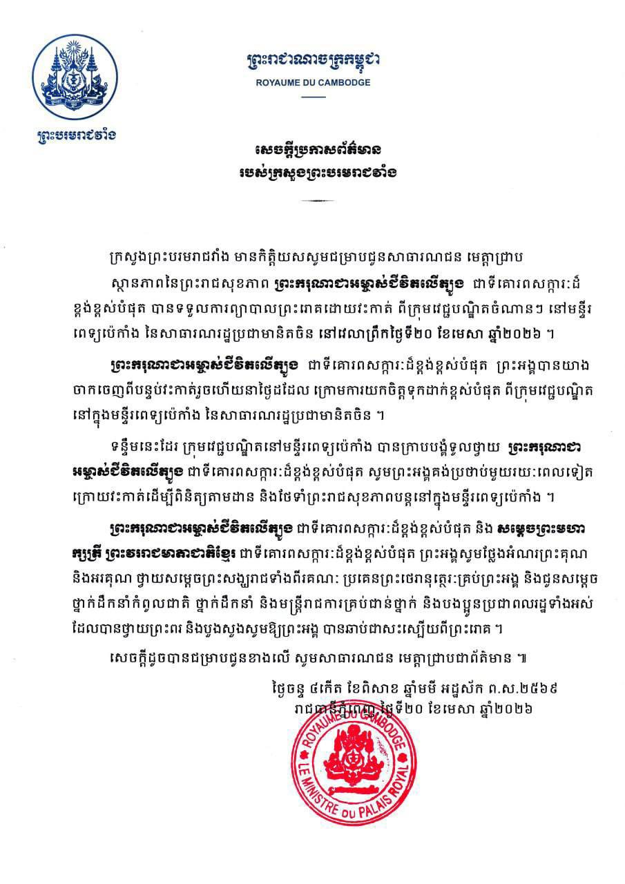 យោងតាមសេចក្តីប្រកាសព័ត៌មានរបស់ក្រសួងព្រះបរមរាជវាំង នៅថ្ងៃទី២០ មេសា ឆ្នាំ២០២៦ ស្ថានភាពនៃព្រះរាជសុខភាព ព្រះករុណាជាអម្ចាស់ជីវិតលើត្បូងជាទីគោរពសក្ការៈដ៏ខ្ពង់ខ្ពស់បំផុតបានទទួលការព្យាបាលព្រះរោគដោយវះកាត់ពីក្រុមវេជ្ជបណ្ឌិតចំណានៗនៅមន្ទីរពេទ្យប៉េកាំង នៃសាធារណរដ្ឋប្រជា មានិតចិន នៅវេលាព្រឹកថ្ងៃទី២០ ខែមេសា ឆ្នាំ២០២៦ ។