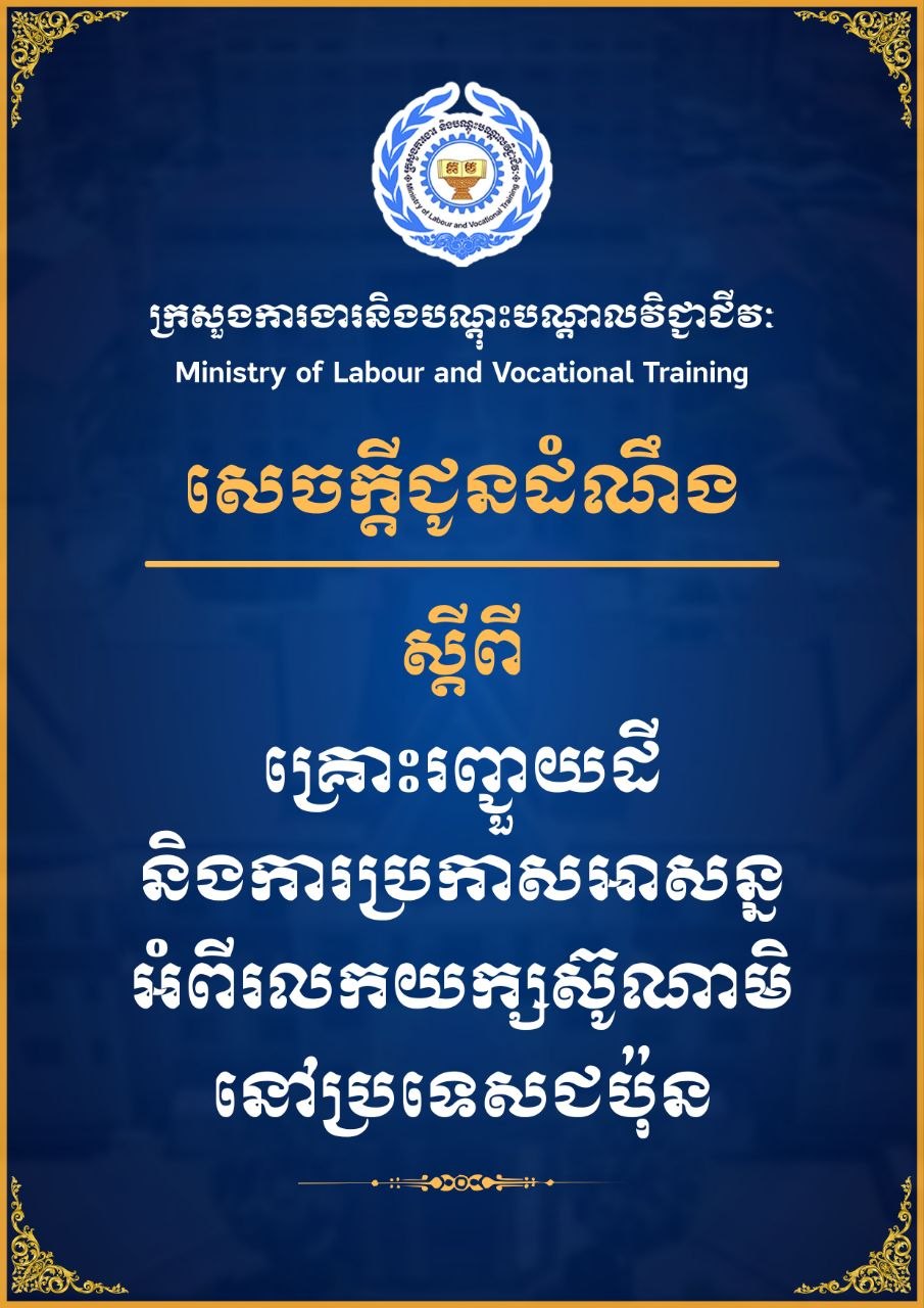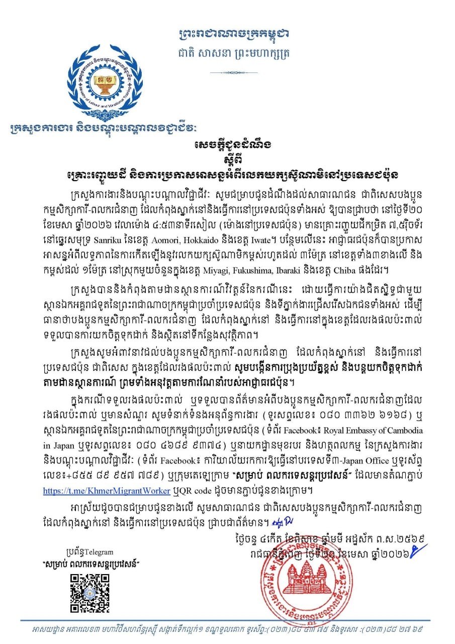 ក្រសួងបញ្ជាក់ថា៖«បងប្អូនកម្មសិក្សាការី-ពលករជំនាញ ដែលកំពុងស្នាក់នៅ និងធ្វើការនៅប្រទេសជប៉ុន ជាពិសេសក្នុងខេត្តដែលរងផលប៉ះពាល់ សូមបង្កើនការប្រុងប្រយ័ត្នខ្ពស់ និងបន្តយកចិត្តទុកដាក់តាមដានស្ថានការណ៍ ព្រមទាំងអនុវត្តតាមការណែនាំរបស់អាជ្ញាធរជប៉ុន» ។