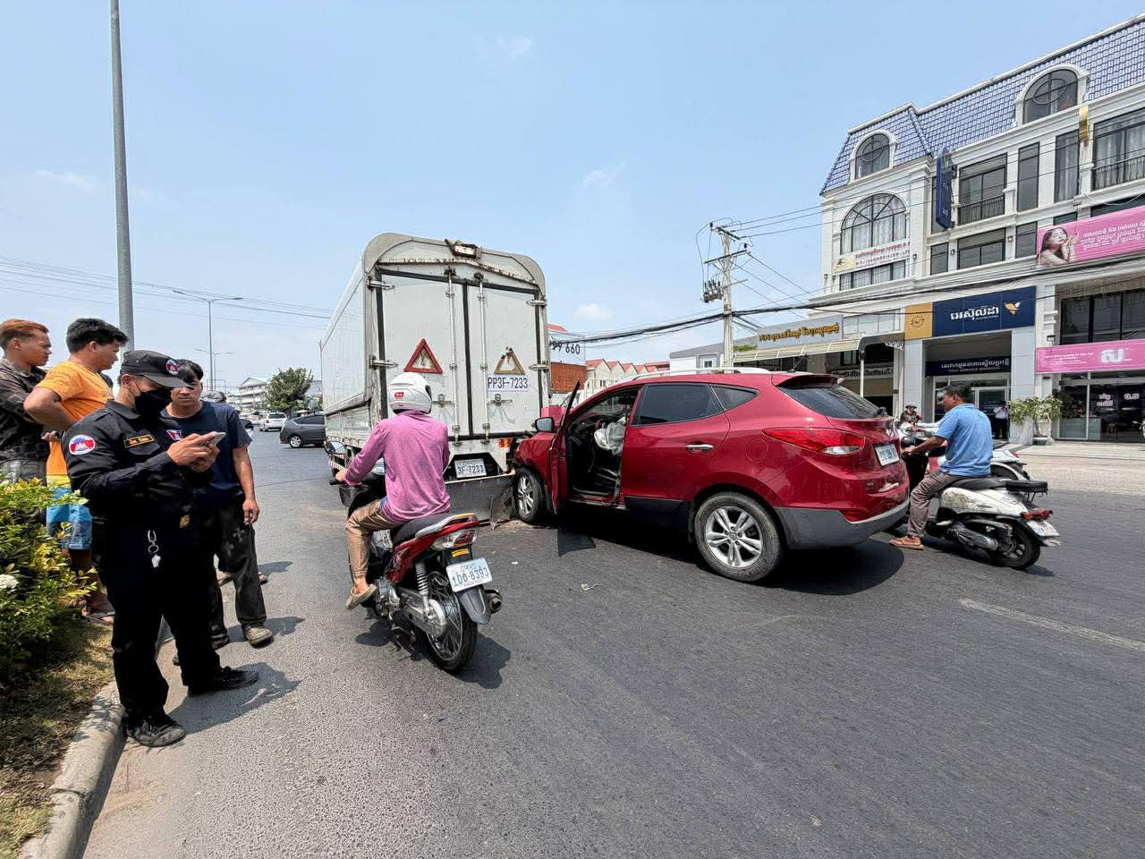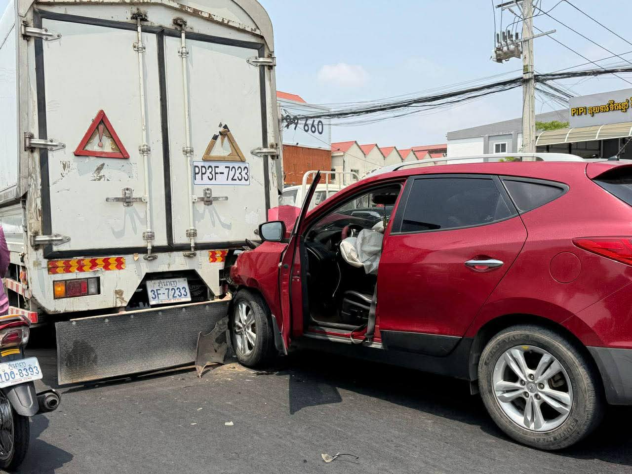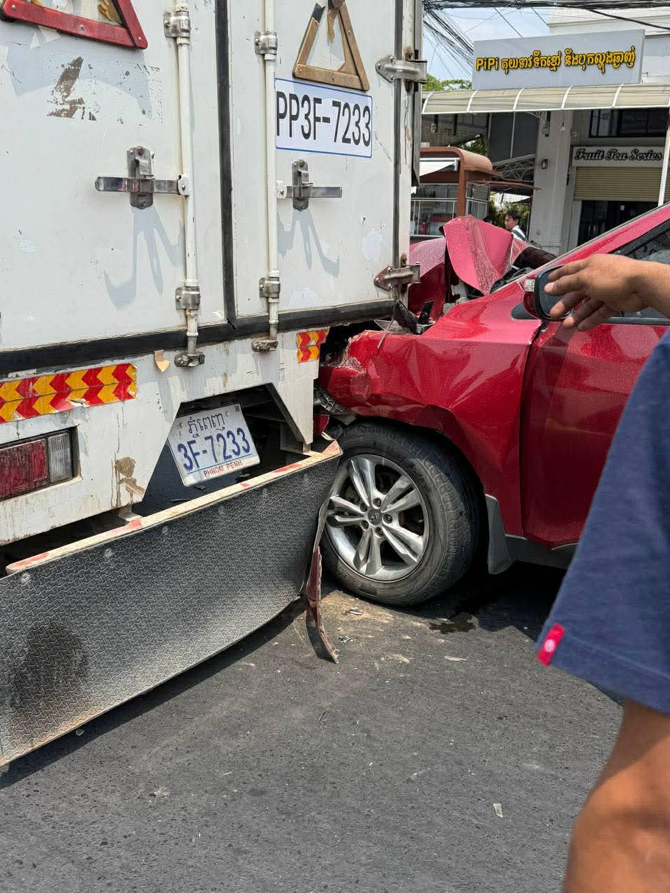 រាជធានីភ្នំពេញ ៖ រថយន្តម៉ាកHyundia SUV ១គ្រឿងបានបើកបរក្នុងល្បឿនលឿនគួរសម ក៏ជ្រុលទៅបុកពីក្រោយរថយន្ត១គ្រឿងទៀតម៉ាកISUZUទ្រុងឃ្លុបដឹកទំនិញដែលកំពុងបើកនៅខាងមុខក្នុងទិសដៅស្របពេញទំហឹង បណ្ដាលឲ្យរថយន្តម៉ាកHyundia SUV នោះរងការខូចខាតខ្ទេចមុខនិងផ្ទុះពោងសុវត្ថិភាព២គ្រាប់ ចំណែកអ្នកបើកបរមិនបានរងរបួសនោះឡើយ…