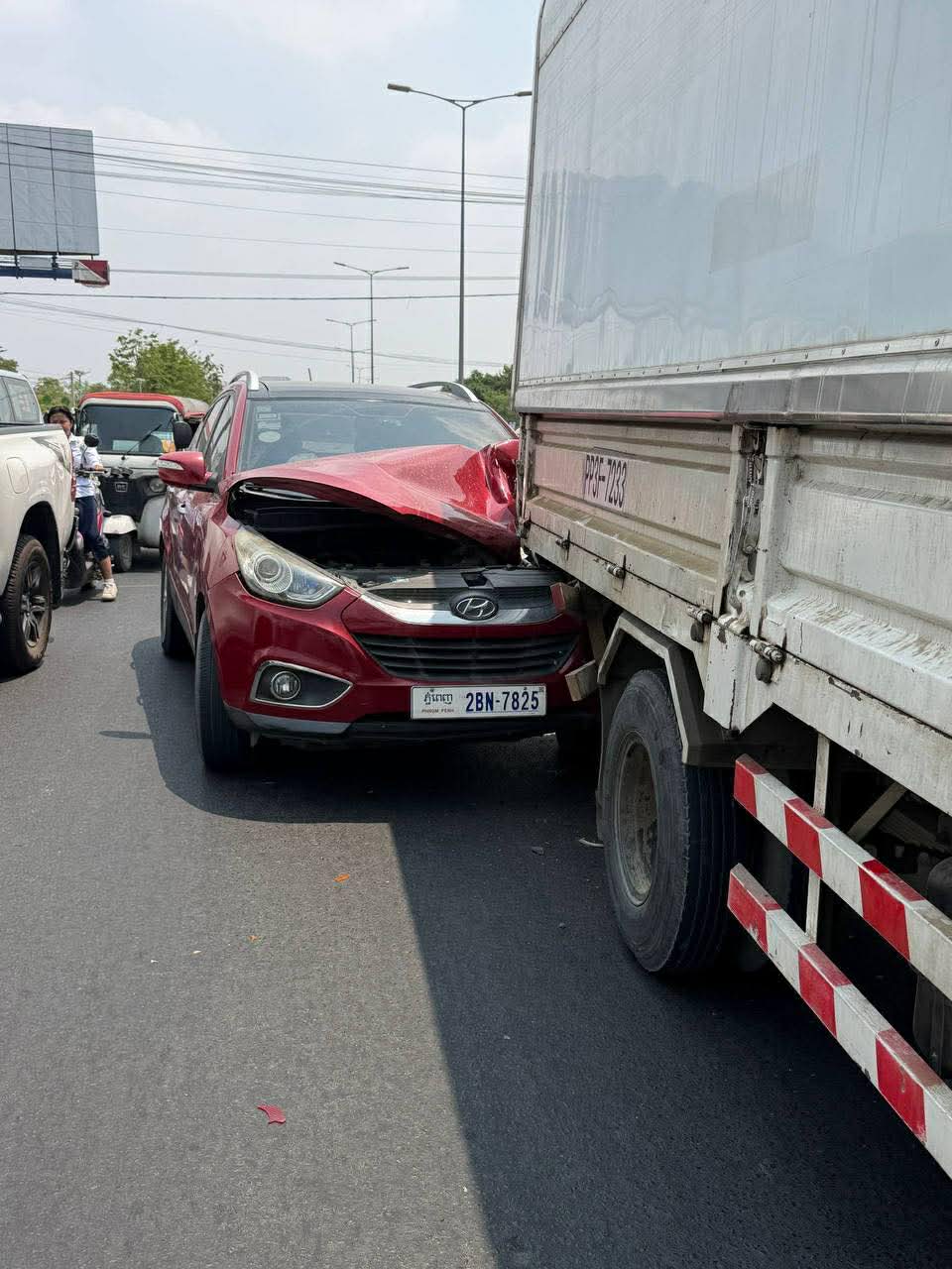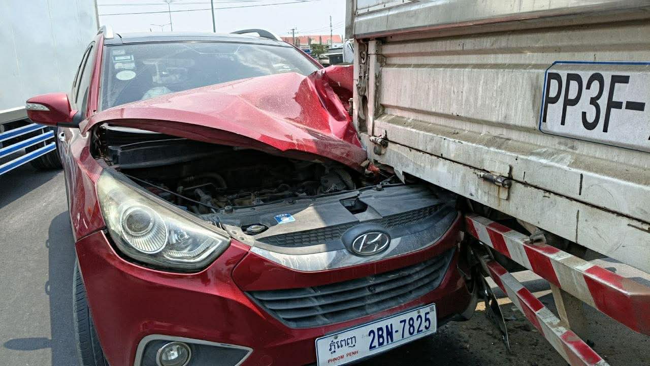 រាជធានីភ្នំពេញ ៖ រថយន្តម៉ាកHyundia SUV ១គ្រឿងបានបើកបរក្នុងល្បឿនលឿនគួរសម ក៏ជ្រុលទៅបុកពីក្រោយរថយន្ត១គ្រឿងទៀតម៉ាកISUZUទ្រុងឃ្លុបដឹកទំនិញដែលកំពុងបើកនៅខាងមុខក្នុងទិសដៅស្របពេញទំហឹង បណ្ដាលឲ្យរថយន្តម៉ាកHyundia SUV នោះរងការខូចខាតខ្ទេចមុខនិងផ្ទុះពោងសុវត្ថិភាព២គ្រាប់ ចំណែកអ្នកបើកបរមិនបានរងរបួសនោះឡើយ ។