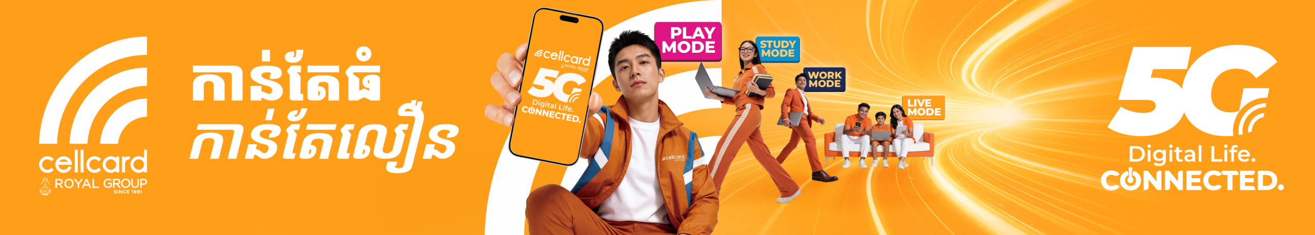 ក្រុមហ៊ុនសែលកាតនឹងបន្តពង្រីកបណ្តាញ 5G របស់ខ្លួនទៅកាន់បណ្តាខេត្តសំខាន់ៗផ្សេងទៀត ដើម្បីគាំទ្រដល់ចក្ខុវិស័យរបស់កម្ពុជា ក្នុងការកសាងសេដ្ឋកិច្ចទំនើប បរិយាបន្ន និងជំរុញដោយឌីជីថល ព្រមទាំងផ្លាស់ប្តូររបៀបដែលមនុស្សរស់នៅ ធ្វើការ រៀនសូត្រ និងកម្សាន្ត។ សូមស្វាគមន៍មកកាន់ទំព័រសករាជថ្មី 5G ពី cellcard!