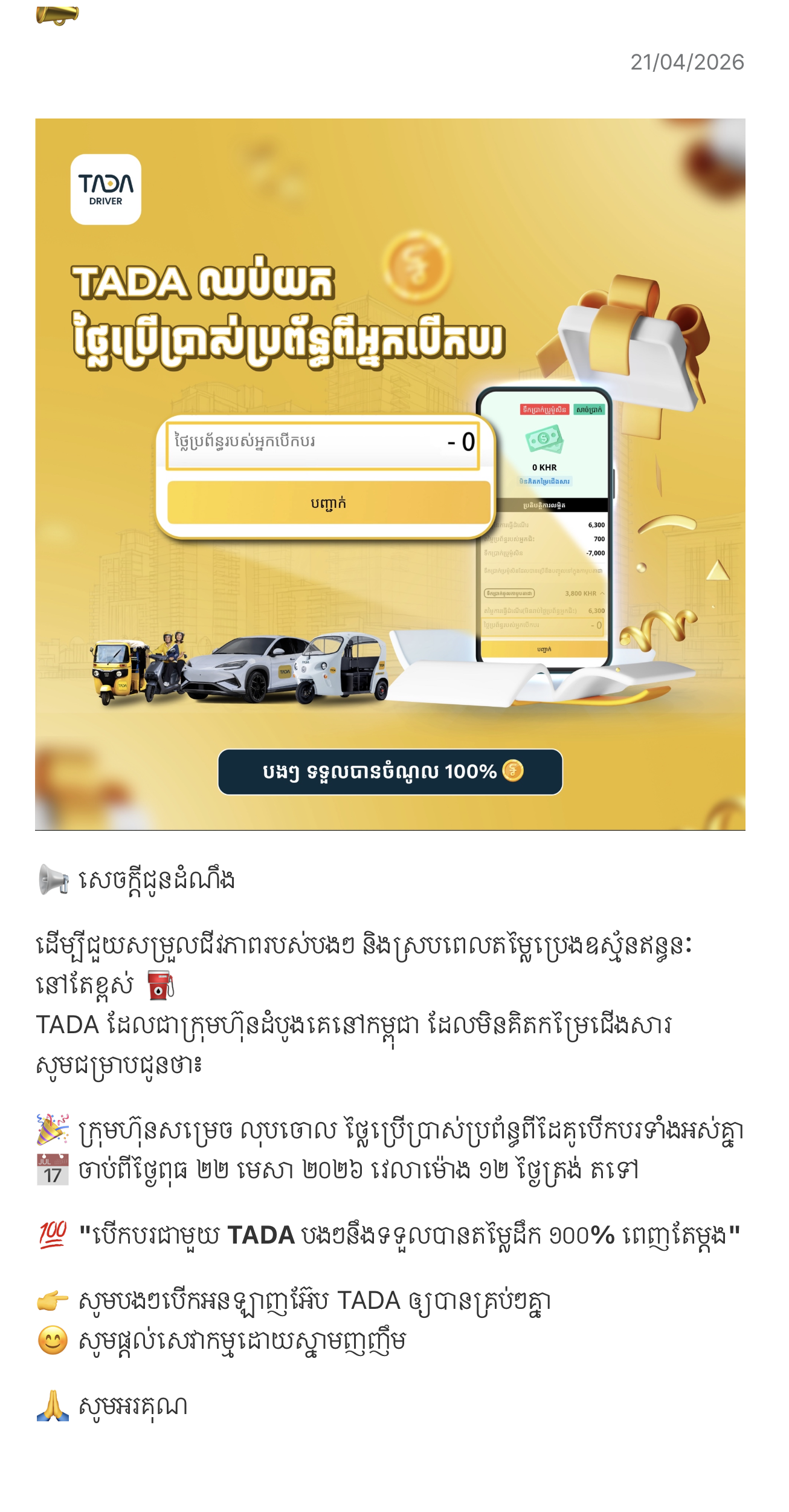 រាជធានីភ្នំពេញ, ថ្ងៃទី ២៣ ខែមេសា ២០២៦ ៖ ក្រុមហ៊ុន TADA បានបញ្ចប់ការយកថ្លៃសេវាប្រើប្រាស់ប្រព័ន្ធទាំងស្រុងពីអ្នកបើកបរ ពោលគឺដៃគូបើកបរដឹកអ្នកដំណើរពុំចាំបាច់ត្រូវបង់ថ្លៃប្រើប្រាស់ប្រព័ន្ធក្នុងអែបTADAទៀតនោះទេ ។ គំនិតផ្ដួចផ្ដើមនេះ គឺស្របតាមចក្ខុវិស័យស្នូលរបស់ TADA ដើម្បីលើកកម្ពស់ជីវភាពដៃគូបើកបរ និងឆ្លើយតបទៅនឹងការកើនឡើងថ្លៃប្រេងឥន្ធនៈ និងហ្គាសនៅទូទាំងពិភពលោក ដែលធ្វើឲ្យប៉ះពាល់យ៉ាងធ្ងន់ធ្ងរទៅដល់ប្រាក់ចំណូលរបស់ដៃគូបើកបរ ។