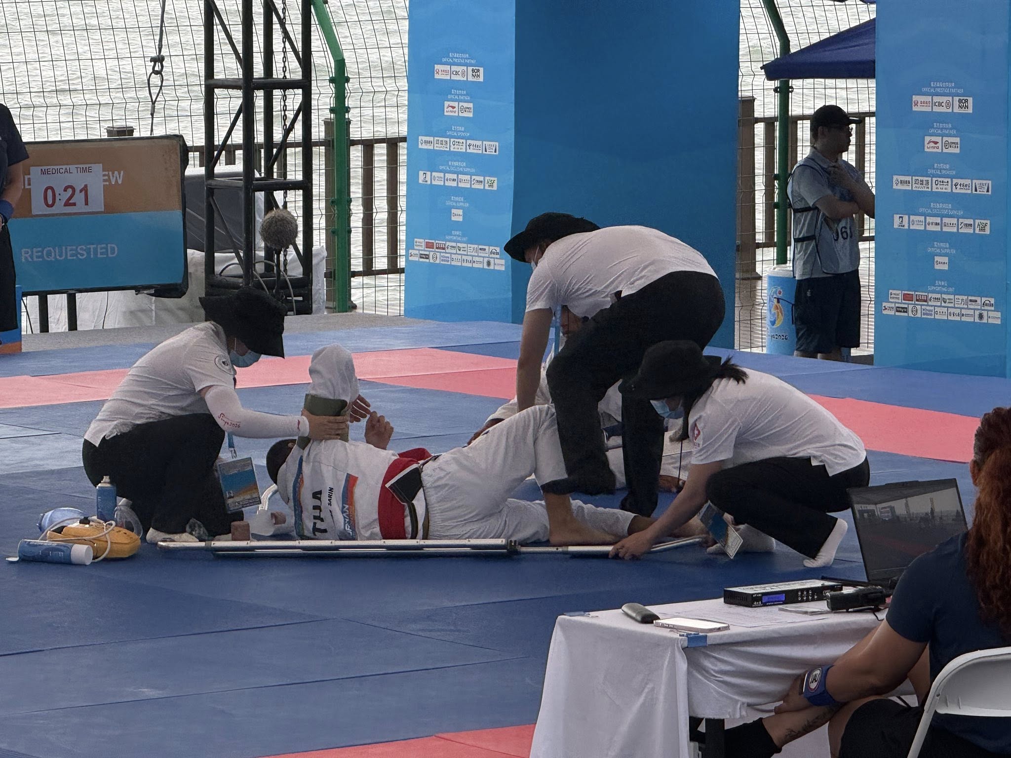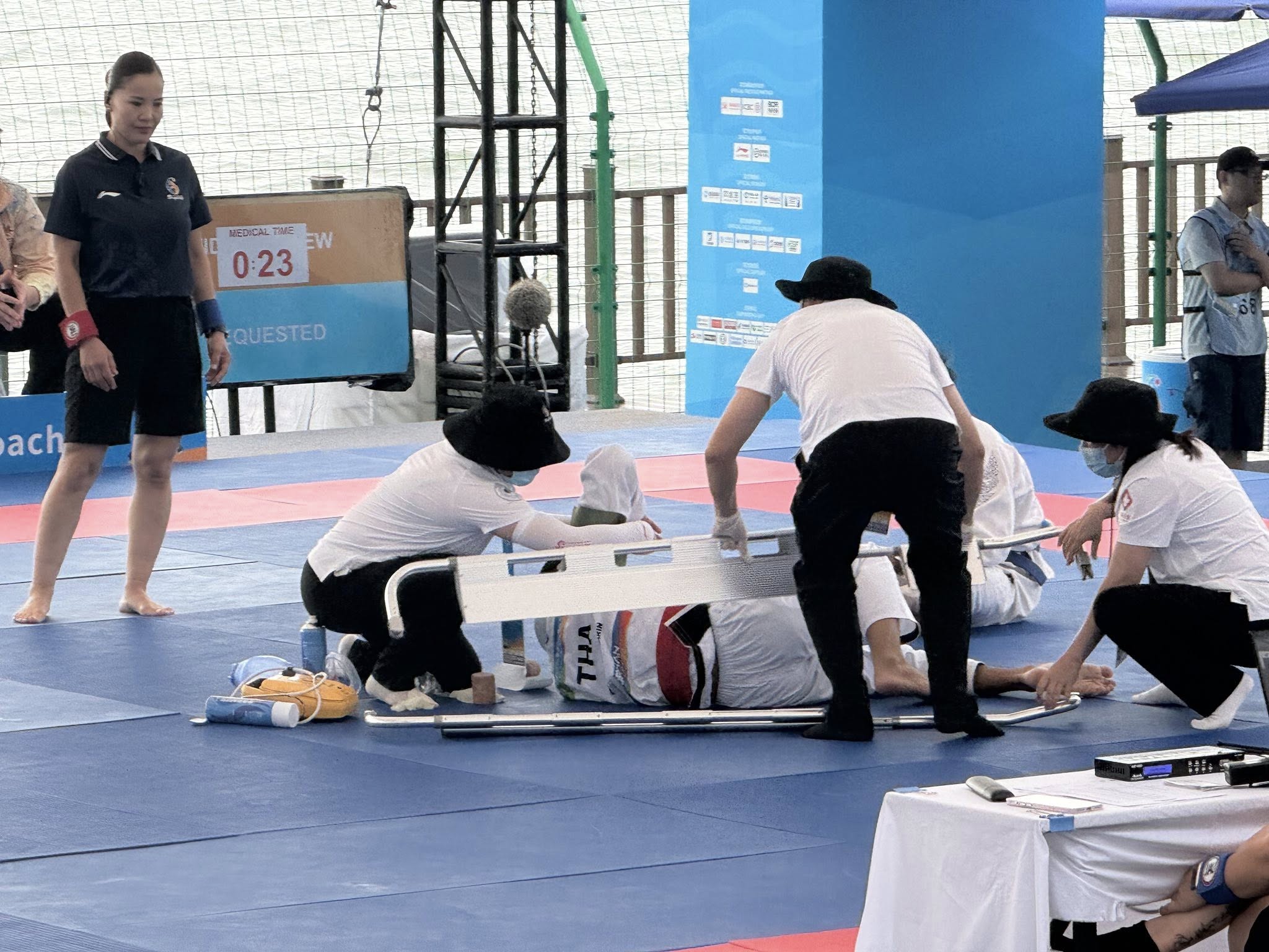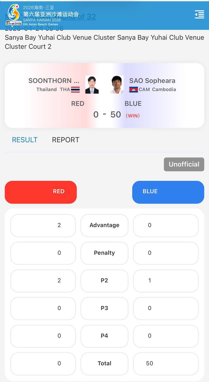 ប្រទេសចិន ៖ កីឡាករជឺជីតស៊ូជម្រើសជាតិកម្ពុជា សៅ សុភារ៉ា បានផ្តួលកីឡាករថៃ Soonthorn Sarin ឱ្យបោះបង់ការប្រកួតក្រោយរបួសស្មា និងសែងចេញពីទីលាន នៅព្រឹកថ្ងៃទី២៤ ខែមេសា ឆ្នាំ២០២៦ ក្នុងវិញ្ញាសារប្រកួតផ្នែកបុរសទម្ងន់ ៦៩គីឡូក្រាម វគ្គ៣២នាក់ចុងក្រោយនៃព្រឹត្តិការណ៍កីឡាឆ្នេរខ្សាច់អាស៊ីលើកទី៦ (The Asian Beach Games 2026) នៅទីក្រុងសាន់យ៉ា (Sanya) ប្រទេសចិន។