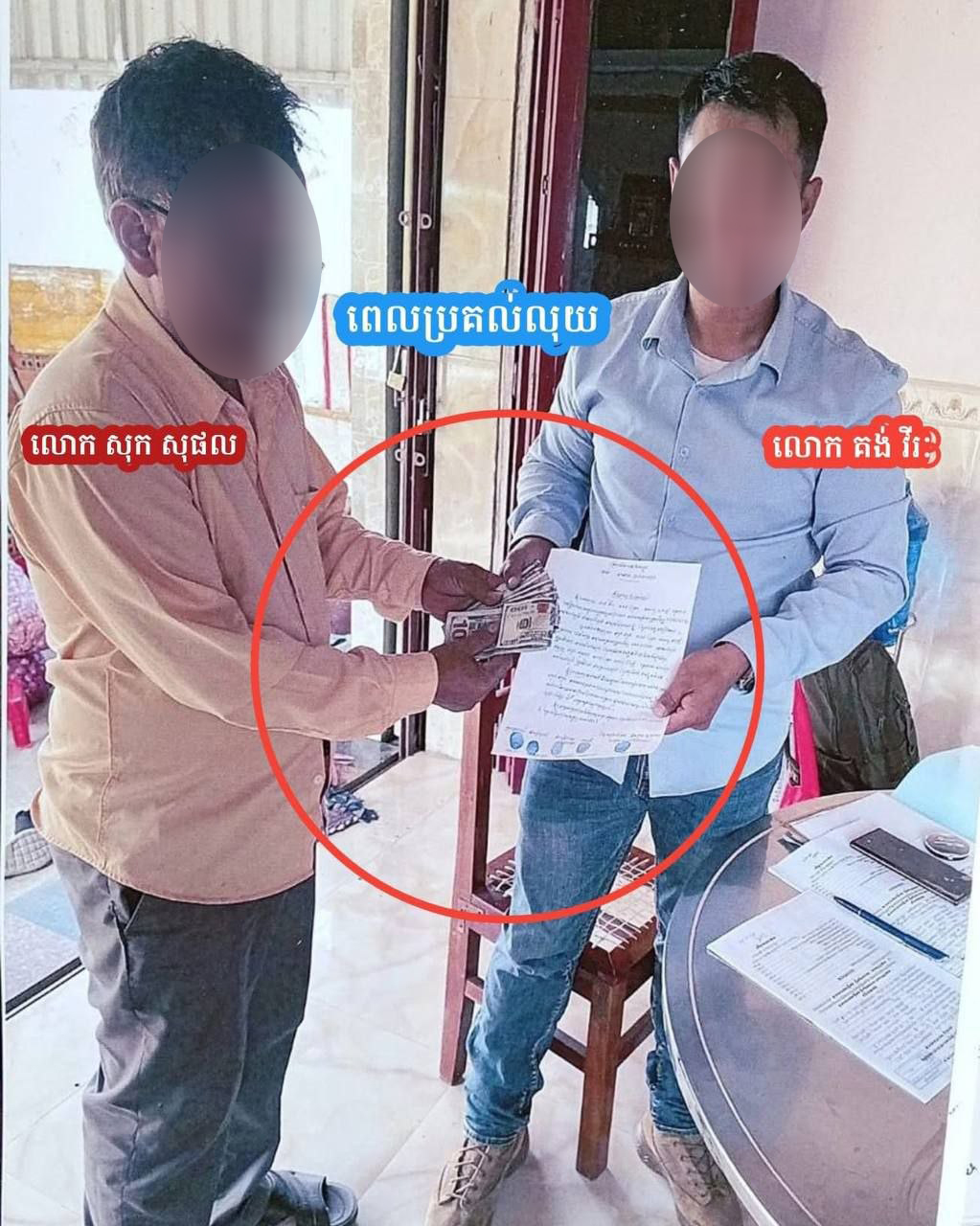 សូមបញ្ជាក់ថា ករណីលោកវរសេនីយ៍ ត្រី គង់ វីរៈ បានធ្វើកិច្ចសន្យា ទទួលប្រាក់ចំនួន ១០ ៥០០ ដុល្លារ ពីឈ្មោះ សុក សុផល ភេទប្រុស អាយុ៥៦ឆ្នាំ មុខរបរលក់ដូរ មានទីលំនៅភូមិថ្នល់បែក សង្កាត់រកាក្រៅ ក្រុងដូនកែវ ខេត្ត តាកែវ ដែលបានប្រគល់លុយឱ្យទៅលោកវរសេនីយ៍ ត្រី គង់ វីរៈ ដើម្បីឱ្យ កូនប្រុស ឈ្មោះ សុខ សុផា ភេទប្រុស អាយុ២៦ ឆ្នាំ មុខរបរសិស្ស កាន់អត្តសញ្ញាណប័ណ្ណ លេខ ១០០៧៧១៨៨៩ រស់នៅភូមិថ្នល់បែក សង្កាត់រកាក្រៅ ក្រុងដូនកែវ ខេត្តតាកែវ ដើម្បីបានចូលបម្រើការងារជាមន្ត្រីកងរាជអាវុធហត្ថ មិនបានសម្រេច ខណៈពេលនោះ ត្រូវបានឪពុកប្តឹងយកលុយវិញ ដើម្បីបញ្ចប់រឿង ។