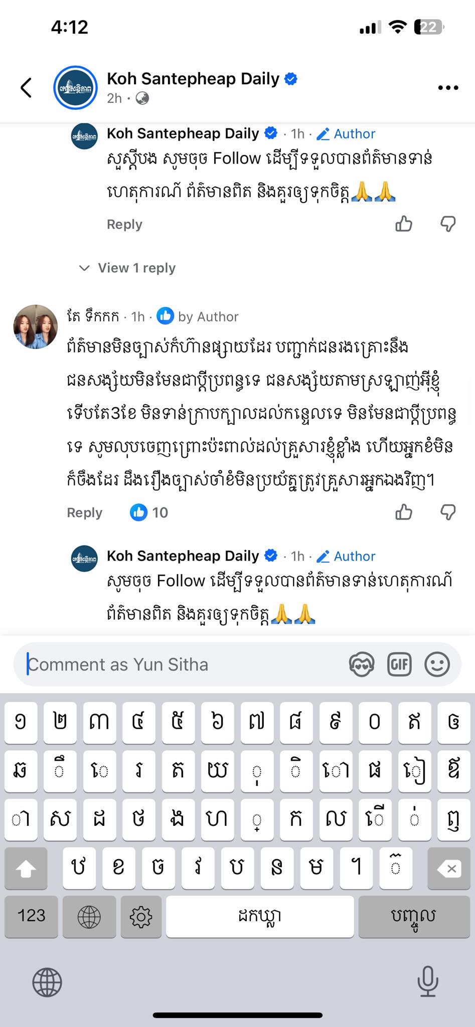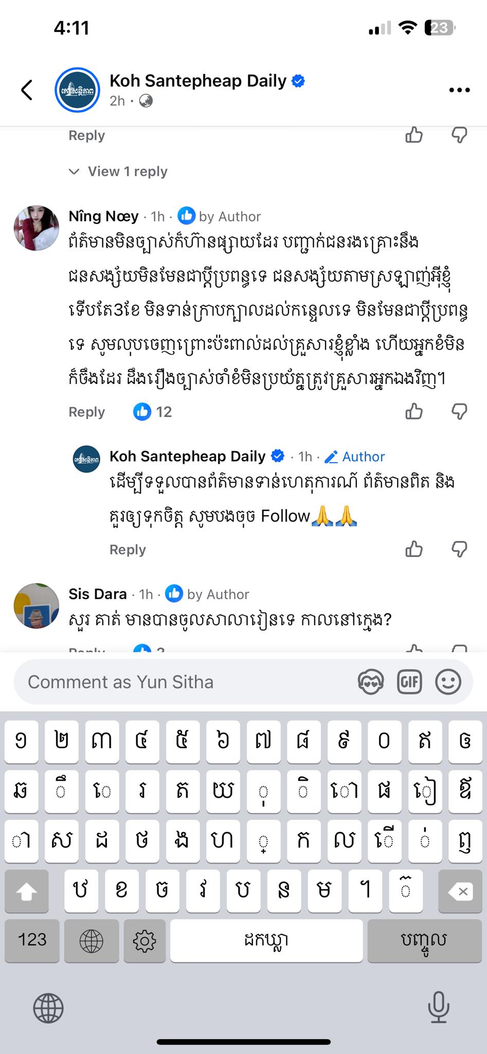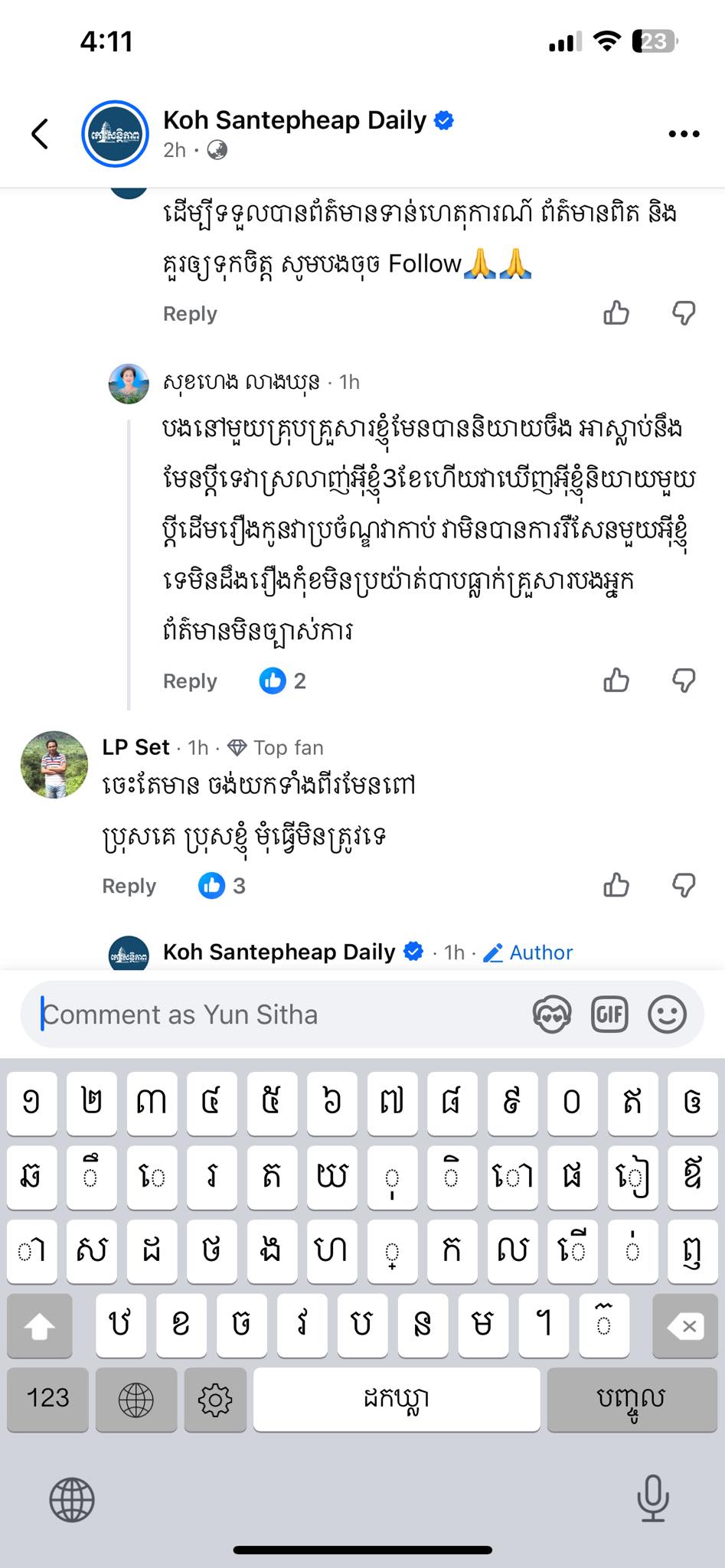ទី២, ហ្វេសប៊ុកឈ្មោះ សុខហេង លាងឃុន បានខមិនថា «បងនៅមួយក្រុមគ្រួសារខ្ញុំមែន បាននិយាយចឹង ? អាស្លាប់នឹងមែនប្តីទេ វាស្រលាញ់អ៊ីខ្ញុំ៣ខែហើយ វាឃើញអ៊ីខ្ញុំ និយាយមួយប្តីដើមរឿងកូន វាប្រចណ្ឌ វាកាប់ វាមិនបានការ រឺសែនមួយអ៊ីខ្ញុំ ទេមិនដឹងរឿងកុំខមិនប្រយ័ត្នបាបធ្លាក់គ្រួសារ បងអ្នកព័ត៌មានមិនច្បាស់ការ ។