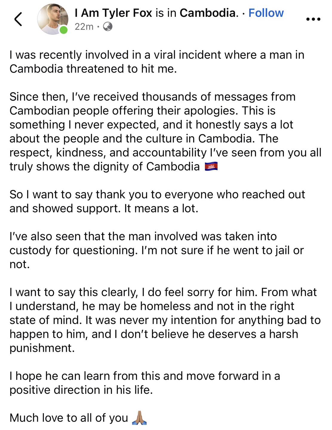 គួរជម្រាបថា ជនបរទេសខាងលើ គឺជាអ្នកទេសចរណ៍ ដែលមានឈ្មោះលើបណ្ដាញសង្គម I Am Tyler Fox លោកដើរថតវីដេអូ Vlog នៅរាជធានីភ្នំពេញ ខណៈនោះ លោកបានដើរក្បែររបងវត្តឧណ្ណាលោមទៅរាក់ទាក់បុរសម្នាក់(ជនអនាថា) ពាក់មួកបៃតង ប៉ុន្ដែបែរជាត្រូវបុរសនោះជេរ ថែមទាំងបង្ហាញកាយវិការ និងពាក្យសម្ដីមិនសមរម្យ ដែលធ្វើឲ្យប៉ះពាល់ដល់មុខមាត់ប្រទេសកម្ពុជាយ៉ាងខ្លាំង ។