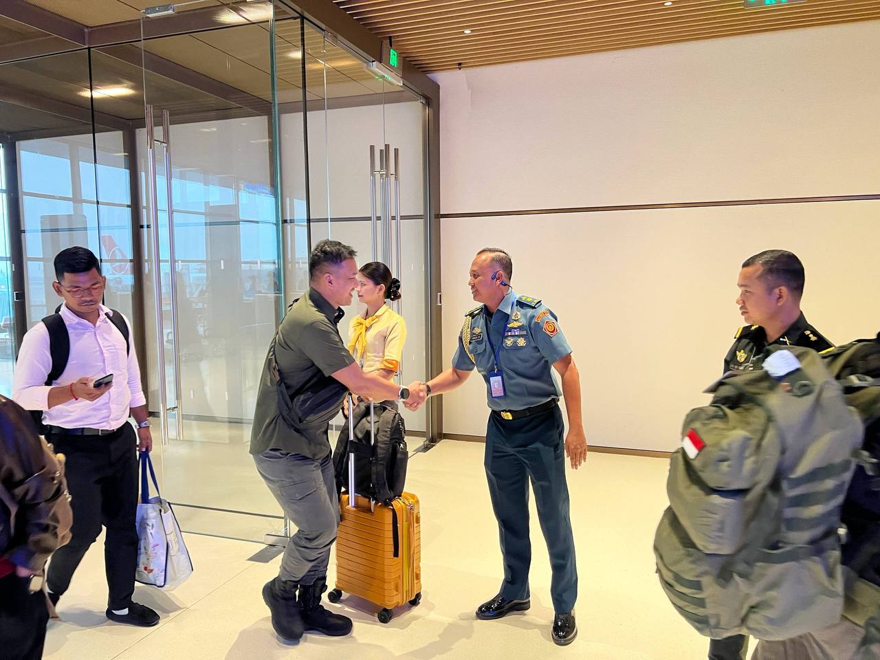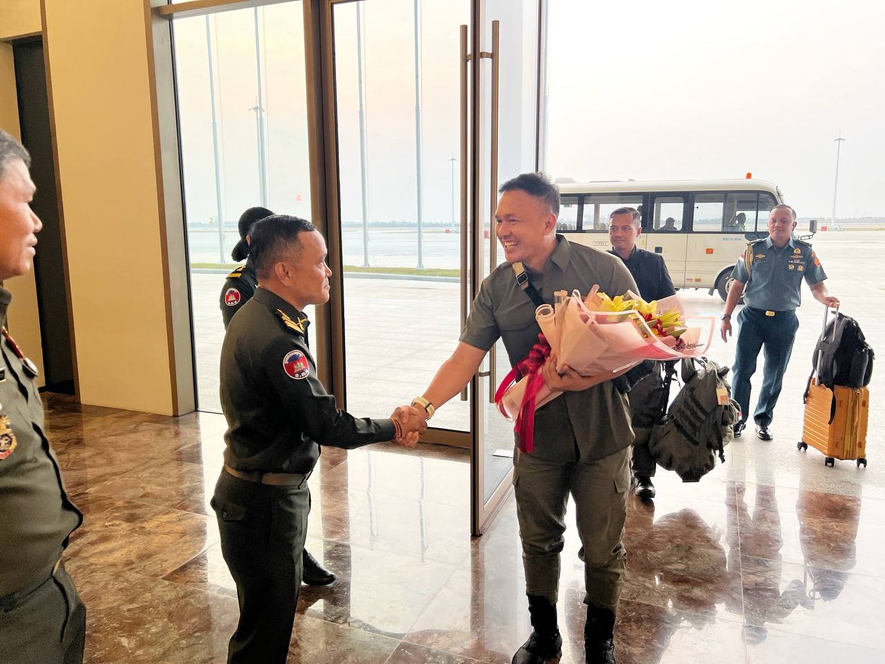កាលពីថ្ងៃទី២៥ ខែមេសា ឆ្នាំ២០២៦ វេលាម៉ោង១៧:២៥នាទីរសៀល នៅអាកាសយានដ្ឋានអន្តរជាតិតេជោ នាយទាហាន នៃនាយកដ្ឋានទាក់ទងអន្តរជាតិ និងក្រុមអ្នកសម្របសម្រួល (CLG) នៃព្រះរាជាណាចក្រកម្ពុជា បានសូមស្វាគមន៍យ៉ាងកក់ក្តៅបំផុត ចំពោះប្រទេសឥណ្ឌូនេស៊ី ដែលបានចាត់បញ្ជូននាយទាហានបន្តវេនចំនួនពីរ (២) រូប (វរសេនីយ៍ទោ DEVI IBROHIM និងវរសេនីយ៍ត្រី RANGGA HADI SAPUTRA ចូលរួមជាមួយក្រុមអ្នកសង្កេតការណ៍អាស៊ាន (AOT) ប្រចាំព្រះរាជាណាចក្រកម្ពុជា ដែលដឹកនាំដោយប្រទេសហ្វីលីពីន ក្នុងនាមជាប្រធានអាស៊ាន ដើម្បីចុះសង្កេតការណ៍ ផ្ទៀងផ្ទាត់ និងធានាការអនុវត្តប្រកបដោយប្រសិទ្ធភាពលើវិធានការទាំងអស់ក្នុងសេចក្តីប្រកាសរួម ។