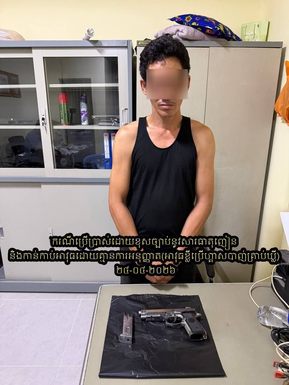 ២-ករណីប្រើប្រាស់ដោយខុសច្បាប់នូវសារធាតុញៀន និងកាន់កាប់អាវុធដោយគ្មានការអនុញ្ញាត(អាវុធខ្លីប្រើហ្គាស់បាញ់គ្រាប់ឃ្លី)៖ ថ្ងៃទី២៤ ខែមេសា ឆ្នាំ២០២៦ វេលាម៉ោង១៤និង៥០នាទីរសៀល ត្រង់ចំណុច ភូមិក្រោលគោ សង្កាត់គីឡូម៉ែត្រលេខ៦ ខណ្ឌឫស្សីកែវ រាជធានីភ្នំពេញ។ ឃាត់ខ្លួនជនសង្ស័យ ០១នាក់ ឈ្មោះ ស៊ុប វណ្ណនី ភេទប្រុស អាយុ ៣៩ឆ្នាំ ជនជាតិខ្មែរឥស្លាម មុខរបរជាងម៉ូតូ មានទីលំនៅ បន្ទប់ជួល ភូមិស្ពានខ្ពស់ សង្កាត់គីឡូម៉ែត្រលេខ៦ ខណ្ឌឫស្សីកែវ។ វត្ថុតាងចាប់យក រួមមាន អាវុធខ្លីប្រើហ្គាសបាញ់គ្រាប់ឃ្លី ០១ដើម(ម៉ាក PIETRO BERETTA គ្មានលេខ) និងឧបករណ៍សម្រាប់ប្រើប្រាស់គ្រឿងញៀនមួយចំនួន។