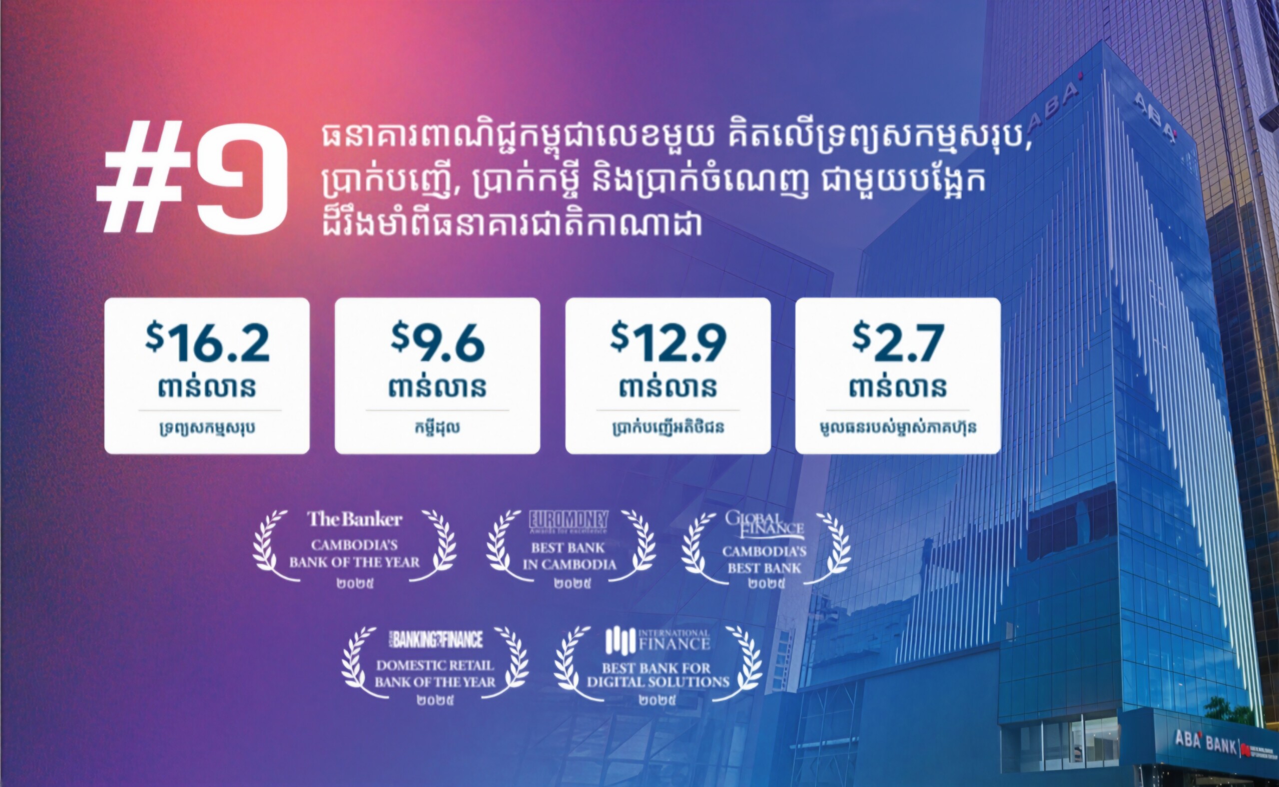 រាជធានីភ្នំពេញ ៖ ធនាគារ ABA បានចេញផ្សាយលទ្ធផលហិរញ្ញវត្ថុសវនកម្មរួចសម្រាប់ឆ្នាំ 2025 ដោយបន្ដនាំមុខក្នុងទីផ្សារ ក្នុងនាមធនាគារពាណិជ្ជធំជាងគេរបស់កម្ពុជា តាមរយៈសមិទ្ធផលដ៏ល្អប្រសើរនៅគ្រប់សូចនាករហិរញ្ញវត្ថុសំខាន់ៗ ។ តួយ៉ាង ទ្រព្យសកម្មសរុបរបស់ធនាគារសម្រេចឈានដល់ 16.2 ពាន់លានដុល្លារអាមេរិក កើនបាន 17% ធៀបនឹងឆ្នាំមុន ។ លទ្ធផលដ៏លេចធ្លោរបស់ធនាគារ ឆ្លុះបញ្ចាំងពីភាពរឹងមាំជាលំដាប់ កំណើនប្រកបដោយវិន័យ និងការប្តេជ្ញាចិត្តយ៉ាងមុតមាំក្នុងការគាំទ្រដល់ការអភិវឌ្ឍសេដ្ឋកិច្ចជាតិ ខណៈពង្រឹងទំនុកចិត្តបន្ថែមទៀតនៅក្នុងវិស័យធនាគារកម្ពុជា ។