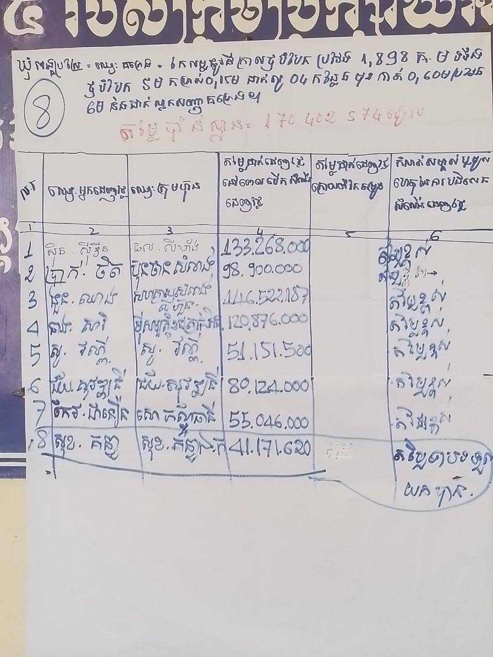 មហាជនលើកឡើងថាផ្លូវ១ខ្សែនេះប្រវែង១,៨៩៨ម៉ែត្រ តម្លៃប៉ាន់ស្មាន១៧០,៤០២,៥៧៤រៀល ក្រុមហ៊ុនសុខ គន្ធា ដាក់តម្លៃទាបបំផុតគឺ តម្លៃ៤១,១៧១,៦២០រៀល ក្រោម៣០ភាគរយ (៣០%)ដូច្នេះថវិកាដែលនៅសល់ពីការដេញថ្លៃចំនួន១២៩,២៣០,៩៥៤រៀល។