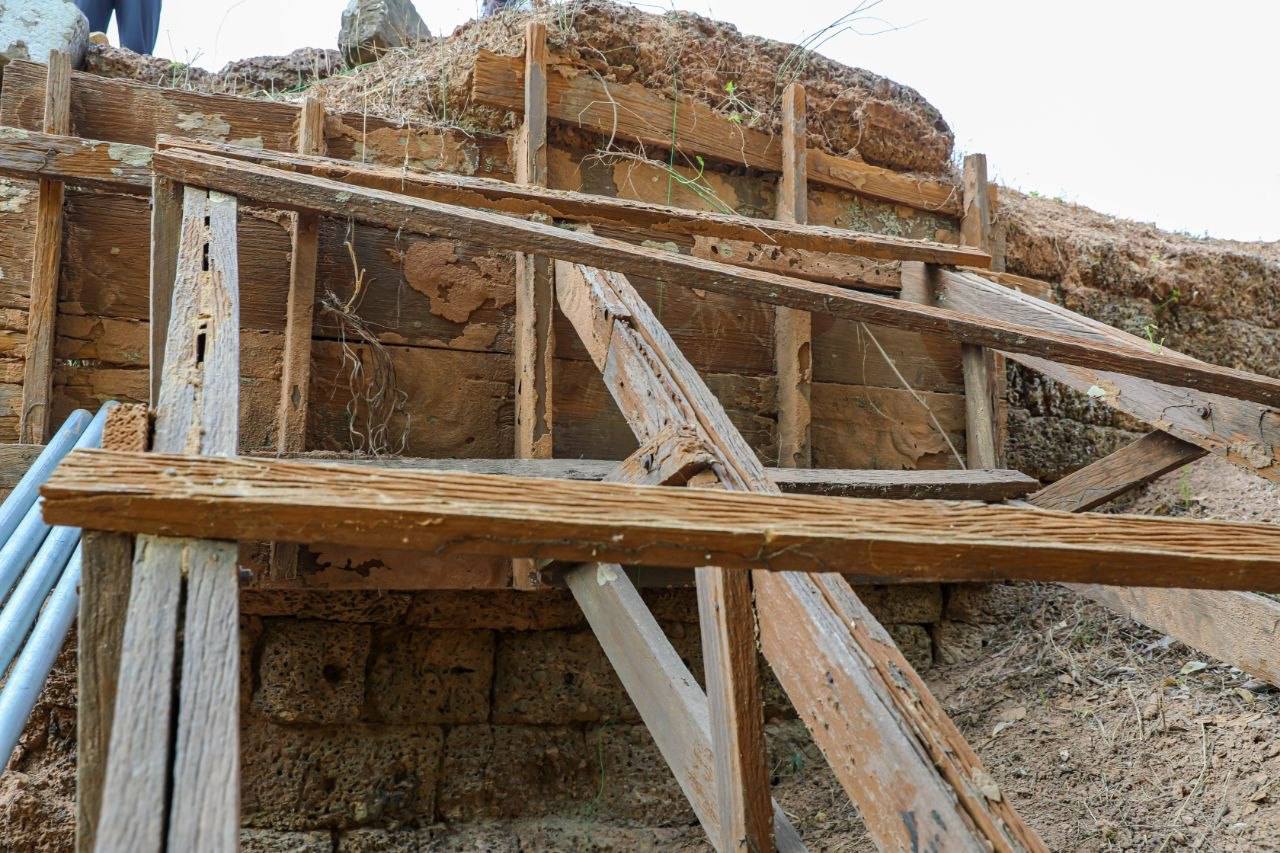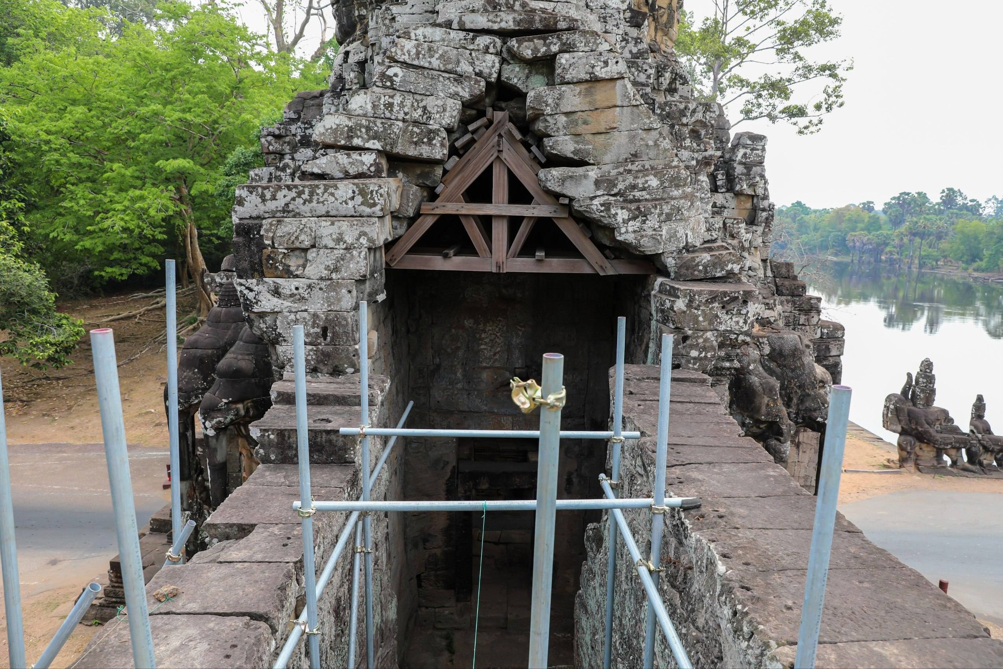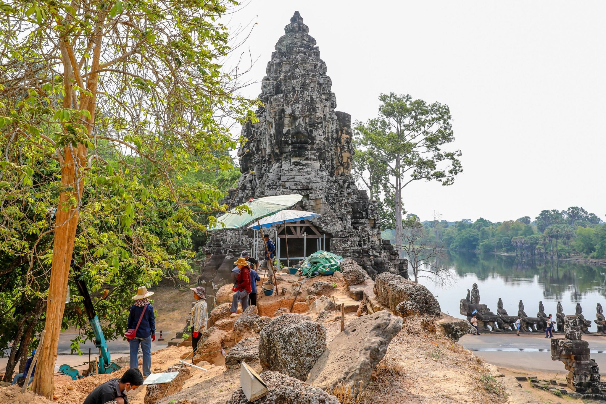 ខេត្តសៀមរាប ៖ ក្រុមអ្នកបច្ចេកទេសនៃអាជ្ញាធរជាតិអប្សរា កំពុងដំណើរការជួសជុលជញ្ជាំងកំពែងធ្វើពីថ្មបាយក្រៀមរបស់ក្រុងអង្គរធំ ដែលមានប្រវែង១៥ម៉ែត្រ នៅផ្នែកខាងត្បូង ឆៀងខាងលិចនៃខ្លោងទ្វារទន្លេអុំ ដែលកំពុងរងការខូចខាតឱ្យប្រសើរឡើងវិញ ។ នេះបើយោងតាមផេកអាជ្ញាធរជាតិអប្សរាបានប្រកាសនារសៀលថ្ងៃទី២៧ ខែមេសានេះ ។