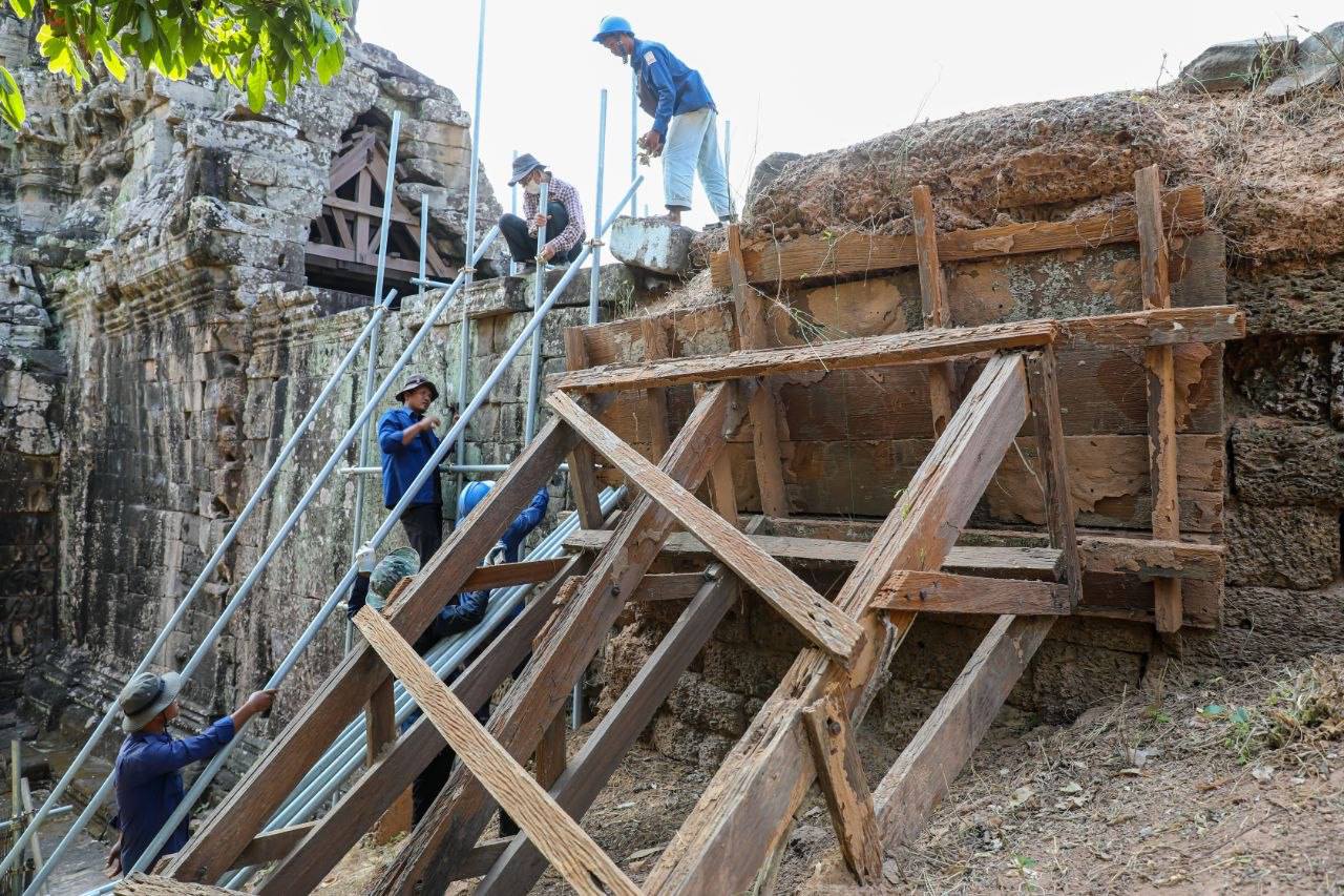ការងារជួសជុលនេះ គឺក្រុមការងារបានអនុវត្តទៅតាមបច្ចេកទេស ដោយមានការទល់ទ្រពេលរើជញ្ជាំង ហើយនៅតាមកន្លែងណា ដែលមានបញ្ហាហែក គឺត្រូវរឹតកុំឱ្យទឹកហូរច្រោះជាដើម ។ រើស្រទាប់ថ្មជញ្ជាំងបាយក្រៀមណា ដែលហែកក្រៀកម្តងមួយស្រទាប់ៗ ហើយត្រូវរៀបឡើងវិញ ។ ប្រសិនបើគ្រឹះមានបញ្ហា គឺត្រូវជួសជុលទាំងគ្រឹះ រួចហើយបន្តជួសជុលជញ្ជាំង ឱ្យរត់ត្រង់ជាមួយខ្លោងទ្វារ ។ ចំណែកកាំជណ្តើរថ្មបាយក្រៀមនឹងរៀបចំឡើងវិញ ដើម្បីជួយទប់ដីកុំឱ្យទឹកភ្លៀងហូរច្រោះ ។