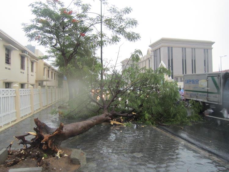 ព័ត៌មានឱ្យដឹងថា ដើមឈើមួយដើមនៅមុខសណ្ឋាគារឡឺប្រេស៊ីដង់ បានដួលរលំ ហើយត្រូវបានសន្តិសុខនាំគ្នាកាប់ចេញពីដងផ្លូវភ្លាមដែរ។