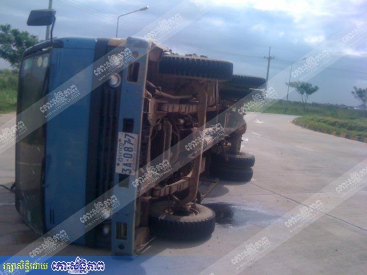 រាជធានីភ្នំពេញ ៖ រថយន្តម៉ាកហ៊ីយ៉ាន់ដាយមួយគ្រឿង ពណ៌ខៀវដឹកភេសជ្ជៈបានបោះពួយចាក់គួត្រង់រង្វង់មូលក្រឡាប់ផ្ងារកង់ កាលពីវេលាម៉ោង៩ព្រឹកថ្ងៃទី១៩ កញ្ញា នៅខាងជើងបញ្ជរបង់ប្រាក់តាមផ្លូវឧកញ៉ាលីយ៉ុងផាត់ ក្នុងភូមិបាក់ខែង សង្កាត់បាក់ខែង ខណ្ឌឫស្សីកែវ ។ ទោះបីយ៉ាងណាពុំបង្កឱ្យមនុស្សរងរបួសឡើយ រីឯរថយន្តបានរងការខូចខាតបែកកញ្ចក់ ។ រថយន្តដែលក្រឡាប់ជារថយន្តដឹកភេសជ្ជៈរបស់ក្រុមហ៊ុនមួយតែគេពុំស្គាល់អត្តសញ្ញាណអ្នកបើកបរទេ ។