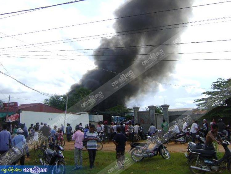 រាជធានីភ្នំពេញ ៖ ឃ្លាំងស្តុកអេតចាយមួយកន្លែងត្រូវអគ្គិភ័យឆាបឆេះយ៉ាងសន្ធោសន្ធៅដោយសារតែការផ្ទុះកំប៉ុងហ្គាស ខណៈពេលដែលកម្មករនៅទីនោះត្រូវបានថៅកែប្រើឲ្យគ្រីបកំប៉ុងស្រាបៀរលាយឡំគ្នាជាមួយនឹងកំប៉ុងហ្គាសបណ្តាលឲ្យផ្ទុះលាន់សូរដូចរន្ទះត្រូវកម្មករពីរនាក់ប្តី-ប្រពន្ធរងរបួសដួលអុកគូទដេកដួលនៅនឹងកន្លែង ព្រមទាំងបង្កឲ្យមានជាអណ្តាតភ្លើងឆាបឆេះយ៉ាងសន្ធោសន្ធៅឡើងតែម្តង។ ហេតុការណ៍នោះបានកើតឡើងកាលពីវេលាម៉ោង៣រសៀលថ្ងៃទី២៥ កញ្ញា ។ ឃ្លាំងស្តុកអេតចាយដែលឆាបឆេះនេះមានទីតាំងស្ថិតនៅក្នុងភូមិត្រពាំងក្រសាំង សង្កាត់ត្រពាំងក្រសាំង ខណ្ឌពោធិ៍សែនជ័យ ។