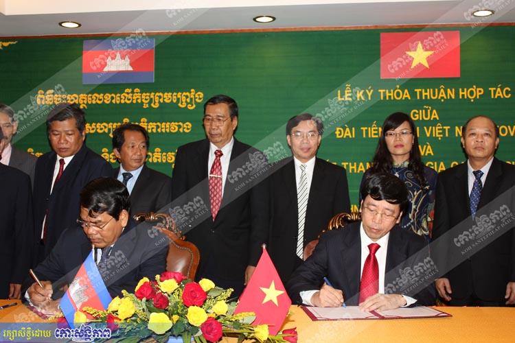 រាជធានីភ្នំពេញ ៖ ពិធីចុះហត្ថលេខាលើកិច្ចព្រមព្រៀងសហប្រតិបត្តិការរវាងវិទ្យុជាតិកម្ពុជា និងវិទ្យុសំឡេងវៀតណាម ដំណាក់កាលឆ្នាំ២០១៣-២០១៦ បានប្រារព្ធធ្វើឡើងក្រោមអធិបតីភាពលោកថាច់ ផែន រដ្ឋលេខាធិការក្រសួងព័ត៌មាន ។ លោកតន់ យ៉ាន ប្រតិភូរាជរដ្ឋាភិបាលកម្ពុជាទទួលបន្ទុកជាអគ្គនាយកវិទ្យុជាតិកម្ពុជា និងលោកង្វៀន ដាងទៀន អគ្គនាយកវិទ្យុសំឡេងវៀតណាម បានចុះហត្ថលេខាលើកិច្ចព្រមព្រៀងនេះនារសៀលថ្ងៃទី២៤ កញ្ញា ឆ្នាំ២០១២ នៅសណ្ឋាគារភ្នំពេញ ។