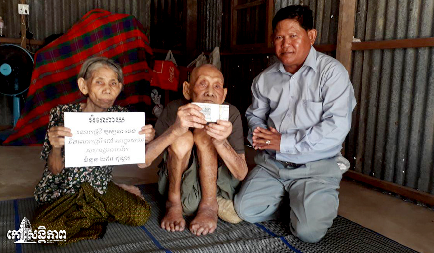 ខេត្តកំពង់ឆ្នាំង ៖ ទឹកប្រាក់ចំនួន២៥០ដុល្លារ ជាអំណោយដ៏ថ្លៃថ្លារបស់សប្បុរសជននៅសហរដ្ឋអាមេរិក យកទៅប្រគល់ជូនដល់លោកតាអាយុ១០០ឆ្នាំហើយ កាលពីរសៀលថ្ងៃទី២១ មីនា ដែលលោកតាកំពុងរស់នៅភូមិបាញ់ឆ្គោល ឃុំជ្រៃបាក់ ស្រុករលាប្អៀរ ។ អំណោយដ៏ថ្លៃថ្លានេះ បានមកពីសប្បុរសជន នៅសហរដ្ឋអាមេរិកចំនួនពីរនាក់ គឺលោកស្រីបុស្សបា ចេង និងលោកស្រី ពៅ មានទឹកប្រាក់សរុបចំនួន២៥០ ដុល្លារ ។ ប្រាក់នេះ បានដូរជាប្រាក់ខ្មែរតាមសំណូមពររបស់ម្ចាស់អំណោយបានចំនួន១លានរៀល ។