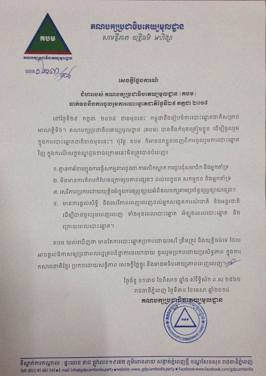 យោងតាមសេចក្តីថ្លែងការណ៍របស់គណបក្សប្រជាធិបតេយ្យមូលដ្ឋានចុះថ្ងៃទី៣០ ខែមេសា ឆ្នាំ២០១៨ បានបញ្ជាក់ថា គណបក្សមួយនេះកំពុងត្រៀមចូលរួមការបោះឆ្នោតជាតិនាពេលខាងមុខ ។ តែ (គ.ប.ម) អាចដកខ្លួនចេញពីការបោះឆ្នោតវិញដែរ ដោយអះអាងថា ការដកខ្លួនចេញក្នុងលក្ខខណ្ឌមួយចំនួនមិនត្រូវបានបំពេញ ទី១ – គ្មានការរំខានក្នុងការធ្វើសកម្មភាពដូចជាការលើកស្លាក ការជួបជុំសមាជិកនិងអ្នកគាំទ្រ ។ ទី២- មិនមានការគម្រាមកំហែងក្រោមរូបភាពផ្សេងៗដល់បេក្ខជន សកម្មជន និងអ្នកគាំទ្រ ៕