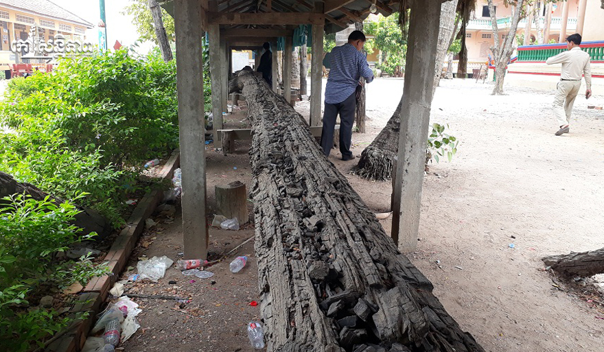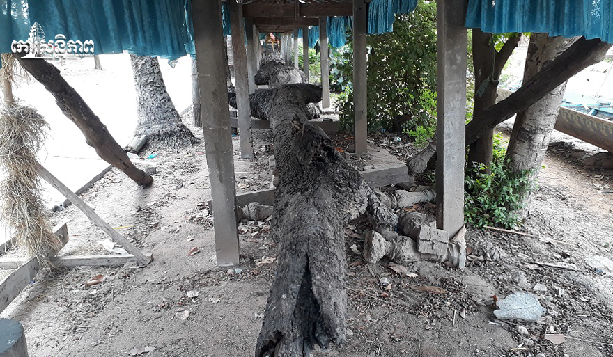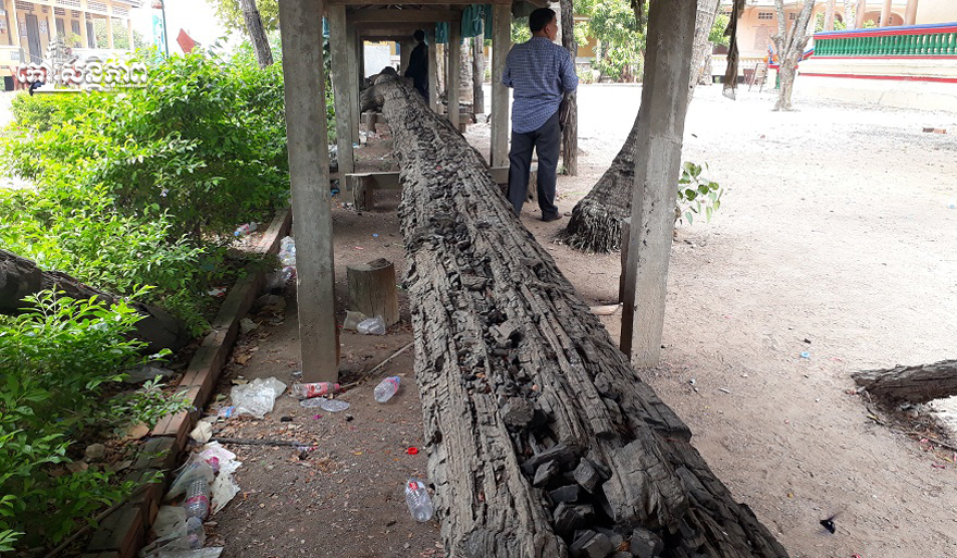 ដោយឡែកលោក សុខ ធួក ប្រធានមន្ទីរវប្បធម៌ និងវិចិត្តសិល្បៈខេត្តបញ្ជាក់ថា ដើមឈើនោះត្រូវបានប្រទះឃើញក្នុងបឹងធំមួយនៅភូមិសំរោងសែនកាលពីជាង៥ឆ្នាំមុន កាលណោះបន្ទាប់ពីក្តៅខ្លាំងបឹងបួរបានរីងគោកអស់ ហើយប្រជាពលរដ្ឋពេលជីកដីក្នុងបឹងនោះក៏ប្រទះឃើញដើមឈើនោះមានប្រវែង៣៣ម៉ែត្រ រួចយកមករក្សទុកក្នុងវត្ត។