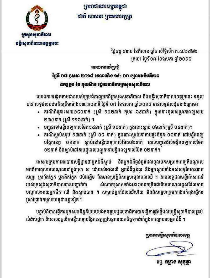 ខេត្តក្រចេះ ៖ សេចក្តីរាយការណ៍បានឱ្យដឹងថា ករណីបងប្អូនជនជាតិព្នងជាច្រើននាក់បានពុល រហូតដល់មានអ្នកស្លាប់ និងអ្នករងគ្រោះនោះ ត្រូវសន្និដ្ឋានបឋមថា គឺបណ្តាលមកពីការពុលមេតាណុលនៅក្នុងស្រា.ស បន្ទាប់ពីបានសម្អាងលើអ្នកជំងឺធ្ងន់ធ្ងរនិងអ្នកស្លាប់ទាំងអស់ គឺសុទ្ធតែមានរោគសញ្ញាស្រវាំងភ្នែក ឬងងឹតភ្នែក ថប់ដង្កើម និងមានប្រវត្តិពិសាស្រាមុនពេលឈឺ ។ នេះបើយោងតាមការដានរបស់ក្រុមអ្នកជំនាញពីក្រសួងសុខាភិបាល និងមន្ទីរសុខាភិបាលខេត្តក្រចេះ ទទួលបានលទ្ធផលបឋមគិតត្រឹមម៉ោង០១ និង៣០នាទីរសៀលថ្ងៃទី០៧ ឧសភា ម្សិលមិញ ។