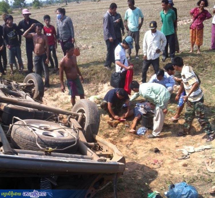 ខេត្តពោធិ៍សាត់ ៖ រថយន្តទួរីសពណ៌សំបកឪឡឹក មួយគ្រឿង ខណៈពេលកំពុងធ្វើដំណើរ ស្រាប់តែផ្ទុះកង់ក្រឡាប់បណ្តាលឱ្យមនុស្សស្រីប្រុស ចាស់ក្មេងចំនួន១៦នាក់ដែលជិះក្នុងរថយន្តនោះរបួសធ្ងន់ និងស្រាល ។ ករណីគ្រោះថ្នាក់ចរាចរណ៍នេះកើតឡើងនៅលើផ្លូវជាតិលេខ៥ ត្រង់ចំណុចភូមិត្រពាំងរំដេញ ឃុំក្បាលត្រាច ស្រុកក្រគរ កាលពីវេលាម៉ោង៩និង៣០នាទីព្រឹកថ្ងៃទី៣០ មីនា ២០១៣ ។