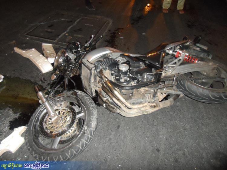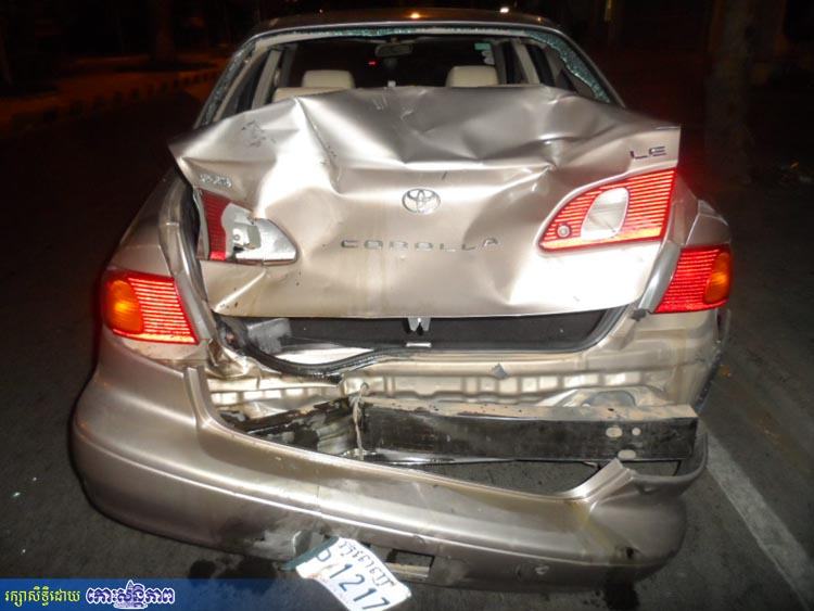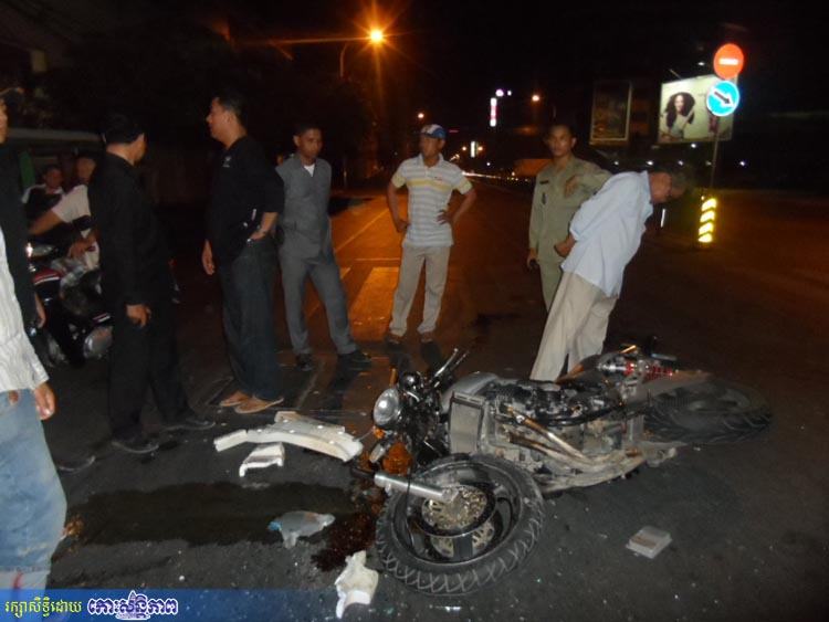 ប្រភពព័ត៌មានពីសមត្ថកិច្ចបានឲ្យដឹងថា ជនជាតិបរទេស២នាក់ មានដឹកឆ្កែមួយក្បាលមកជាមួយផង ជិះម៉ូតូហុងដា CB400 ពណ៌ទឹកប្រាក់ តាមមហាវិថីព្រះមុនីវង្ស ក្នុងទិសដៅស្របគ្នាជាមួយរថយន្តកូរ៉ូឡា ពណ៌ស្ករ ដែលជិះក្នុងល្បឿនធម្មតា ស្រាប់តែម៉ូតូជិះមកពីក្រោយលឿនពេកចាប់ហ្វ្រាំងមិនទាន់ក៏ជ្រុលទៅបុកចំស្លាកលេខរថយន្តធ្វើឲ្យរថយន្តខូចខាតមួយកំណាត់ផ្នែកខាងក្រោយ ចំណែកអ្នកជិះម៉ូតូផ្លោងផុតកំបូលរថយន្ត បណ្តាលឱ្យរងរបួសធ្ងន់ម្នាក់ និងស្រាលម្នាក់ ៕