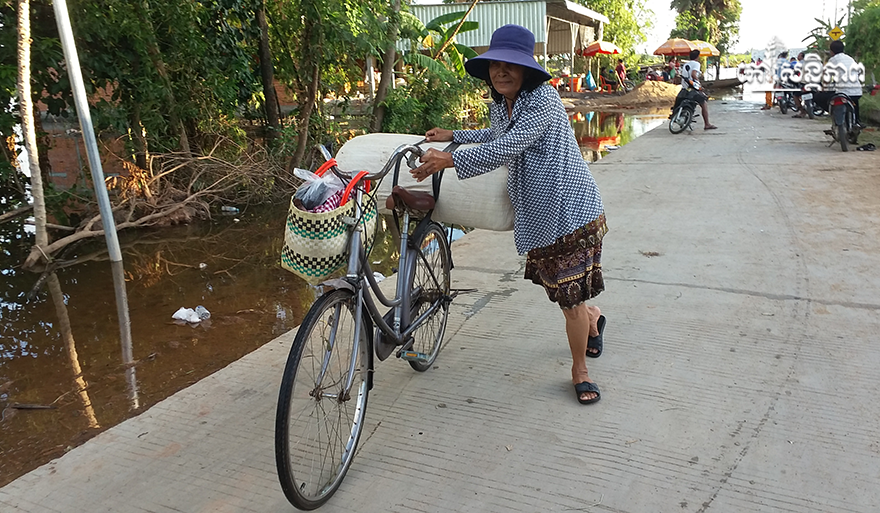ខ្វះខាតក៏បានឲ្យប្តីលើកដាក់លើកង់១គ្រឿង ហើយគាត់បានបណ្តើរកាត់ទឹកលិចផ្លូវបេតុងត្រឹមភ្លៅ ហើយក៏ព្រួយខ្លាចដួលទទឹកថ្នាំជក់ផងដែរ ។ ត្បិតភ្នែកពិការម្ខាងនិងកម្លាំងមិនសូវជាមាំប៉ុន្មានក៏ប្រឹងទប់កង់ដែលមានដឹកថ្នាំជក់នោះរហូតដល់ផ្លូវបេតុងដែលទឹកមិនលិច ត្រូវជិះកង់ឆ្លងស្ពានកោះប៉ែនមកកាន់ក្រុងកំពង់