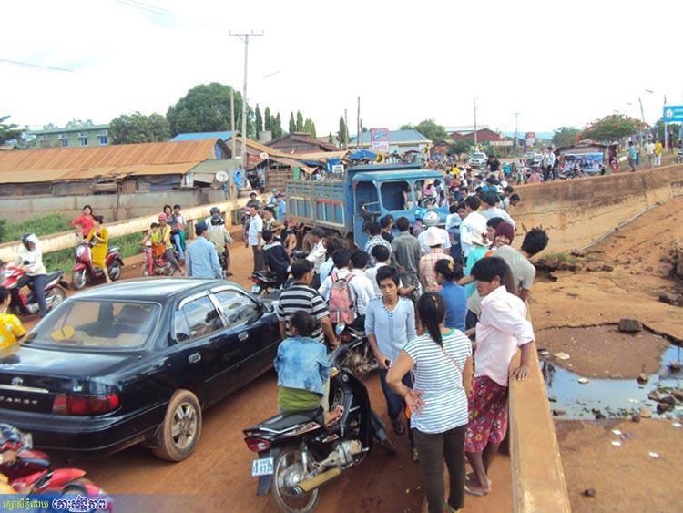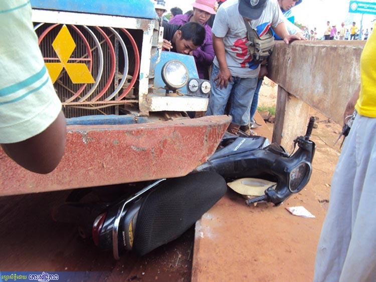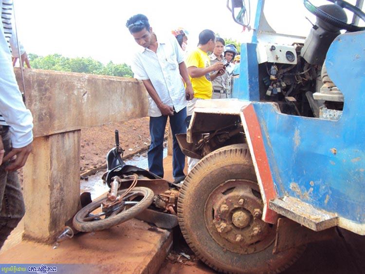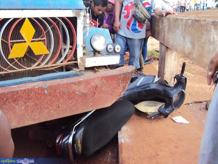 ខេត្តឧត្តរមានជ័យ ៖ គ្រោះថ្នាក់ចរាចរណ៍មួយកើតឡើងដោយគោយន្តច្នៃរេចង្កូតបុកម៉ូតូបើកបរដោយស្ត្រីម្នាក់មានដឹកកូនតូច២នាក់ប៉ើងខ្ទាតធ្លាក់ទៅបាតស្ពានកម្ពស់៥ម៉ែត្រ បង្កឱ្យស្ត្រីអ្នកបើកបរម៉ូតូរបួសធ្ងន់បាក់ជើង និងបែកក្បាល ឯកូនតូច២នាក់ទៀតរបួសស្រាល ។