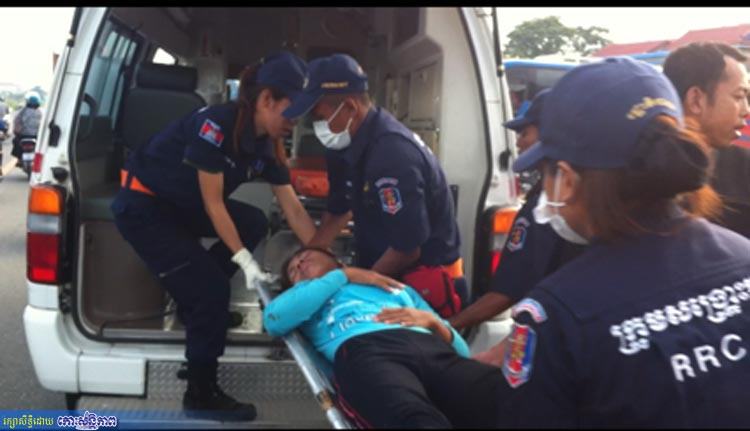រាជធានីភ្នំពេញ៖ រថយន្តកូរ៉េម៉ាកហ៊ីយ៉ាន់ដាយ ពណ៌ខៀវ របស់ក្រុមហ៊ុនរោងចក្រកាត់ដេរ វៀលបេស ដឹកកម្មករទៅធ្វើការបើកគេចពីរថយន្តកូរ៉េដែលខូចកំពុងរុញតាមផ្លូវ ក៏វ៉ាក់អឺជាមួយនឹងឡានក្រុងមួយគ្រឿងបត់ចូលចំណតក៏គេចពីឡានក្រុងនេះទៅបុកម៉ូតូពីក្រោយពេញទំហឹងបណ្ដាលឱ្យស្ត្រីម្នាក់រងបួសធ្ងន់ រីឯបុរសអ្កបើកបររងរបួសស្រាល។