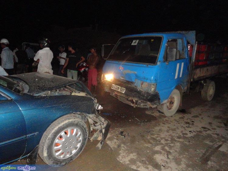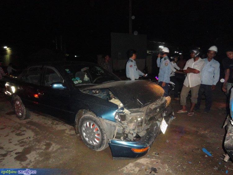 រាជធានីភ្នំពេញ ៖ បុរសស្រវឹងស្រាម្នាក់បើករថយន្តកូរ៉ូឡា ពណ៌សម្បកឪឡឹក ក្នុងល្បឿនលឿន ហើយព្យាយាមបើកវ៉ារថយន្តនៅពីមុខ ក៏ជ្រុលចង្កូតទៅបុករថយន្តកូរ៉េដឹកប្រេងម៉ាស៊ីន ពណ៌ខៀវ មួយគ្រឿងទៀតចំពីមុខពេញទំហឹង បណ្តាលឱ្យរថយន្តទាំងពីរខ្ទេចមុខមួយកំណាត់ដូចគ្នា ។ ហេតុការណ៍នេះកើតឡើងកាលពីវេលាម៉ោង៩ និង៥នាទីយប់ ថ្ងៃទី៣ មិថុនា តាមបណ្តោយផ្លូវភ្នំពេញ-ហាណូយ ស្ថិតក្នុងសង្កាត់ឃ្មួញ ខណ្ឌសែនសុខ ។