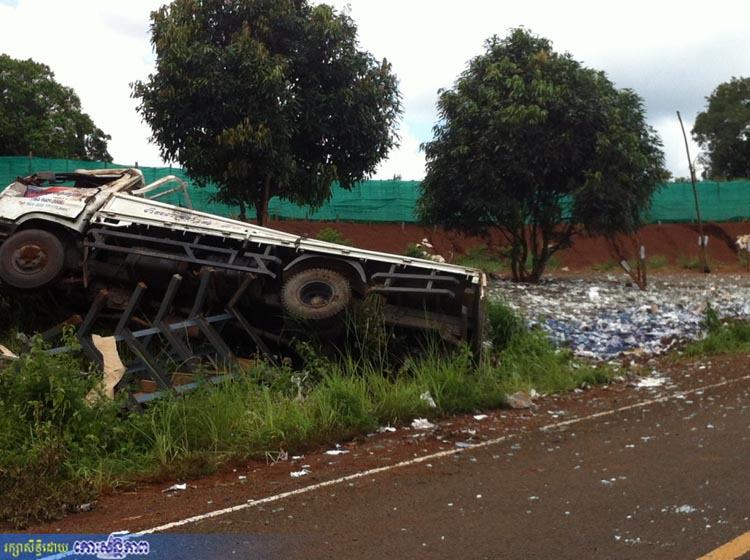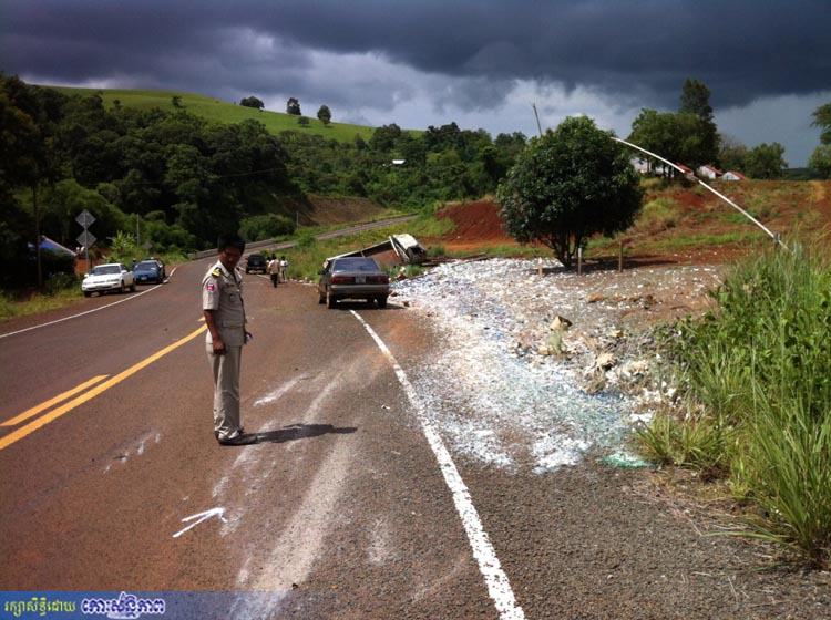 រថយន្តកូរ៉េដឹកកញ្ចក់ពីភ្នំពេញទៅមណ្ឌលគិរី ក្រឡាប់របួសធ្ងន់ស្រាល៤នាក់