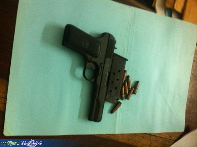 រាជធានីភ្នំពេញ ៖ បុរសជាងកុំព្យូទ័រម្នាក់បានត្រូវប៉ូលិសប៉ុស្តិ៍ផ្សារដេប៉ូទី២ឃាត់ខ្លួន កាលពីវេលាម៉ោង៣និង១៥នាទីរសៀលថ្ងៃទី៦ មិថុនា នៅពេលធ្វើដំណើរទៅលួងលោមប្រពន្ធដែលលែងលះគ្នាប្រមាណ១ឆ្នាំក៏មានទំនាស់គ្នាហើយចាក់សោបង្ខាំងប្រពន្ធនិងដកកាំភ្លើងភ្ជង់គំរាមរកបាញ់ទៀតនៅផ្ទះលេខ៩១BE1Z ផ្លូវលេខ២១៥ សង្កាត់ផ្សារដេប៉ូទី២ ខណ្ឌទួល គោក ។ នៅពេលឃាត់ខ្លួន សមត្ថកិច្ចដកហូតបានកាំភ្លើងខ្លីម៉ាកកា៥៤មួយដើម មាន៧គ្រាប់។