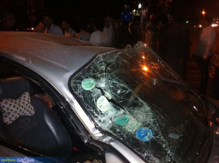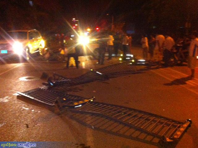 រាជធានីភ្នំពេញ ៖ របាំងថ្មចែកទ្រូងផ្លូវ ៧កង់ ស្ថិតតាមបណ្តោយមហាវិថីព្រះមុនីវង្ស បានរងការខូចខាតទាំងស្រុង ខណៈដែលបុរសម្នាក់បើករថយន្តកូរ៉ូឡា ១គ្រឿង ពណ៌ស្ករ ពាក់ស្លាកលេខ ភ្នំពេញ 2B-6445 ធ្វើដំណើរពីជើងទៅត្បូង តាមបណ្តោយមហាវិថីព្រះមុនីវង្ស លុះមកដល់ចំណុចជិតមន្ទីរពេទ្យម៉ាលីយ៉ា ស្ថិតក្នុង
